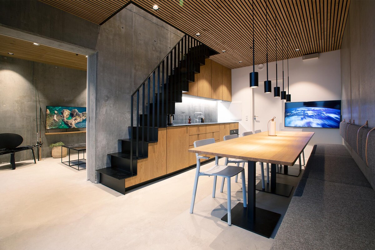 Possibilité unique de séjourner directement sur le quai et à seulement 3 mètres du bord de l'eau dans le bâtiment emblématique de Bjarke Ingels sur la nouvelle île d'Aarhus. Wifi et parking privé inclus. Par beau temps, la promenade du port juste à l'extérieur est très fréquentée. Salle de bain confortable et bien aménagée avec mezzanine. Fantastique, orienté sud, vue panoramique à 180 degrés sur l'eau, le port et la ligne d'horizon de la ville. Un petit salon quand il fait beau - parfait pour les couples ou les voyageurs d'affaires. Coin cuisine avec bouilloire électrique et réfrigérateur - pas possible de faire de la nourriture chaude.