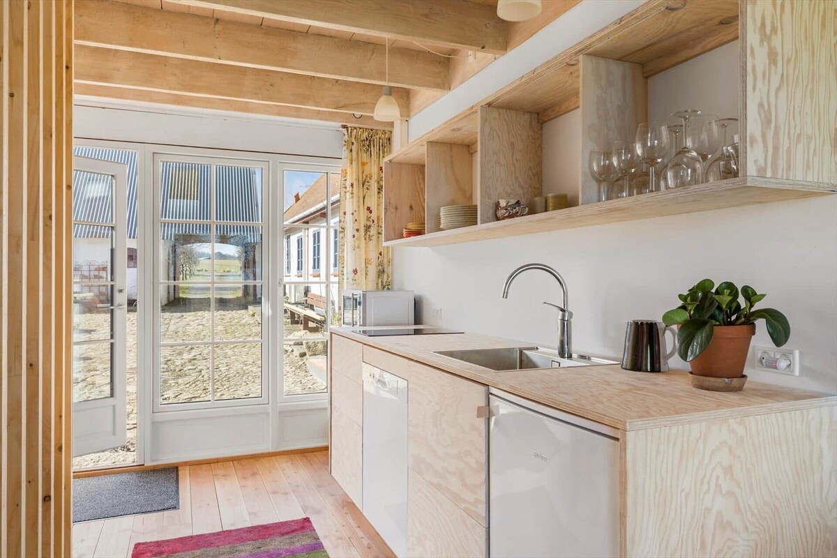 Appartement de charme et joliment aménagé sur 2 étages, 75 m², dans l'ancienne grange d'une cour historique à 4 côtés, cuisine de haute qualité avec grand salon, salle de bain élégante avec douche à effet pluie et chauffage par le sol et toilettes invités séparées au rez-de-chaussée. Deux chambres à coucher séparées avec des lits boxspring confortables de haute qualité de 180 cm au premier étage, terrasse ensoleillée avec une vue magnifique sur la mer, au milieu d'une prairie de fleurs sauvages, à 700 m d'Aarsdale.