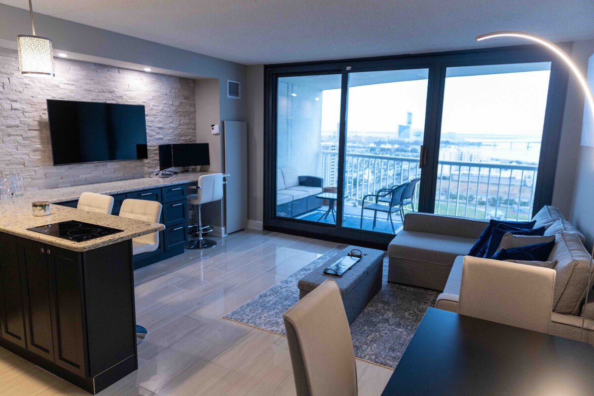 This brand new spacious waterfront condo is the perfect getaway! This luxurious apartment sits in a 32-story building with breathtaking waterfront view that overlooks the city with your own private balcony. We are 5 minutes away from Atlantic City boardwalk, Casinos and Outlets. Monthly rentals and winter rentals available. Stay with us and enjoy the night light with great entertainment and accommodations in the building. - Restaurant -Bar -Arcade -Pool and Hot Tub -Gym Free Parking!