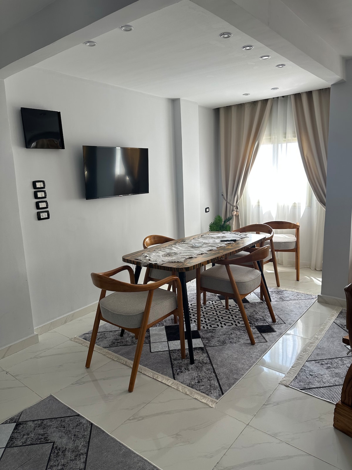 Cet appartement luxueux est conçu dans un style moderne et élégant avec des finitions en bois dans chaque coin, offrant un mobilier confortable et un éclairage époustouflant qui réconforte l'œil et le cœur. Il comprend 3 chambres, un salon spacieux avec un coin confortable, une télévision connectée de 65 pouces et une bibliothèque suspendue avec de superbes décorations et reliure en bois, une cuisine entièrement équipée, deux salles de bains et un grand balcon avec une vue charmante sur la mer Méditerranée, pour une expérience exceptionnelle qui allie confort, luxe et beauté.