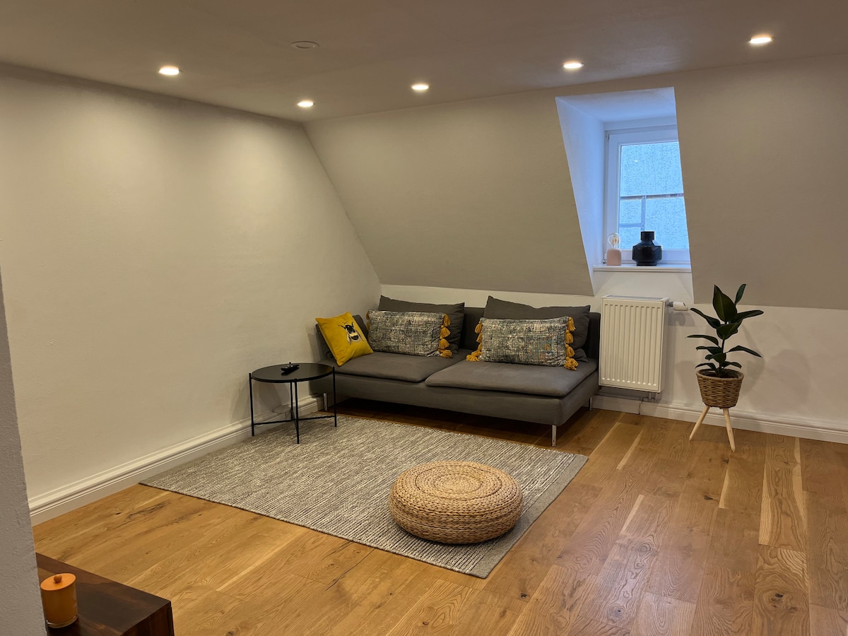 Près de 45 m ² duplex appartement mansardé, avec tout le monde ce qui est important pour un petit appartement en ville. Salon avec canapé, TV et Internet. Cuisine à l'état neuf avec cuisinière, four, lave-vaisselle, cafetière et réfrigérateur. Par un escalier, vous entrez dans la partie supérieure de l'appartement avec salle de bains et chambre. Petite salle de bain à la lumière du jour avec baignoire. Le mur de verre intégré permet une douche simple. Chambre avec lit double de 1,60. Armoire de plain-pied. Plancher en bois de chêne agréable