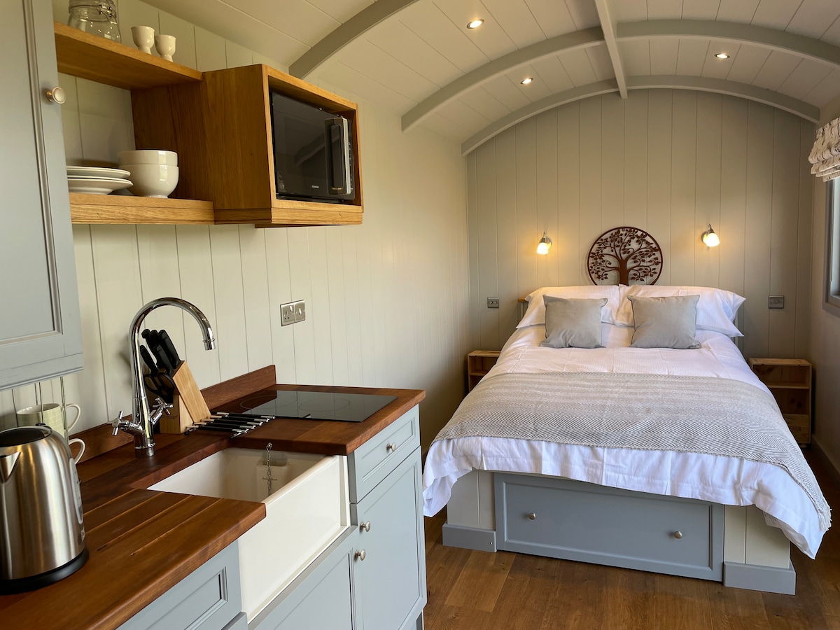 Harcomb Farm Shepherds Huts propose trois cabanes pouvant accueillir deux adultes avec un salon ouvert et une salle d'eau. Dans un champ tranquille de cette zone de beauté naturelle exceptionnelle, ces refuges magnifiquement présentés disposent d'un lit double et d'une cuisine, d'une salle d'eau et d'un patio extérieur privé, qui donne sur la campagne idyllique des Cotswolds et au-delà. C'est un refuge vraiment magnifique offrant paix et détente, et chacun dispose d'un jacuzzi chauffé au bois et d'un brasero.
