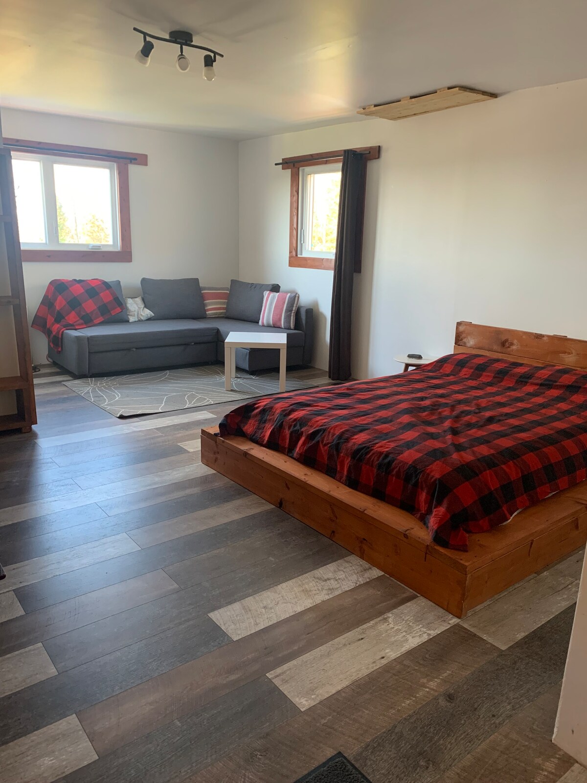 Magnifique loft près du centre‑ville. Idéalement situé et équipé pour des séjours de courts ou longs. Profitez d’un accès au jacuzzi ouvert à l’année, d’un garage, de stationnements extérieurs et d’une terrasse avec foyer. Entrée privée avec serrure à code. Comprend une cuisine complète, Wi‑Fi, TV de 52" avec apps de streaming et une console PS4. Borne 30A via adaptateur NEMA 14‑50P (vous devez apporter votre adaptateur d'auto). Notez : accès uniquement par escaliers. Aucune rampe d’accès.