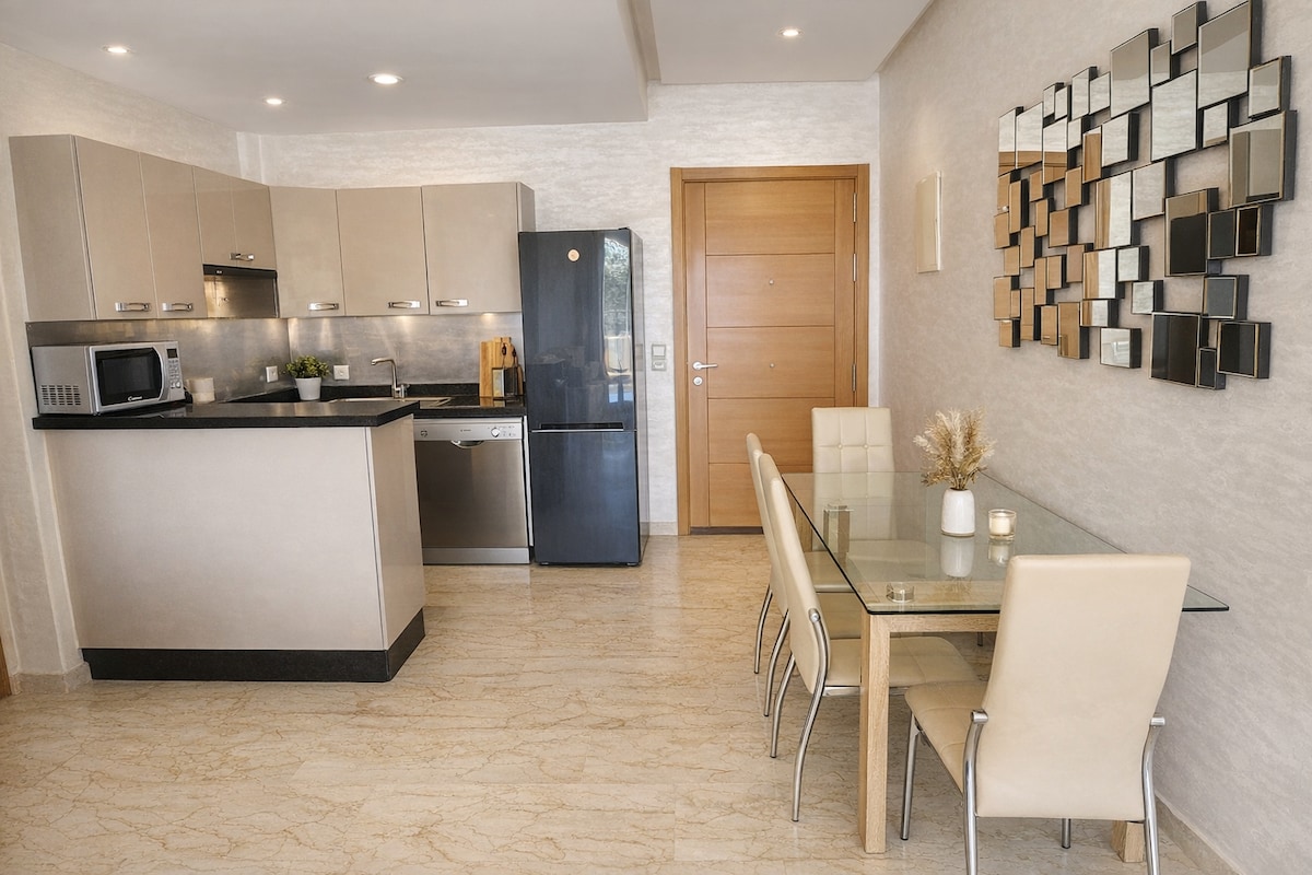 Détendez-vous dans cet appartement paisible et moderne à seulement 5 km de la plage d'Agadir. Avec une connexion Wi-Fi haut débit, une télévision connectée avec Netflix, un espace de travail dédié et une cuisine entièrement équipée, il est parfait pour le travail à distance ou une escapade élégante sur la côte.