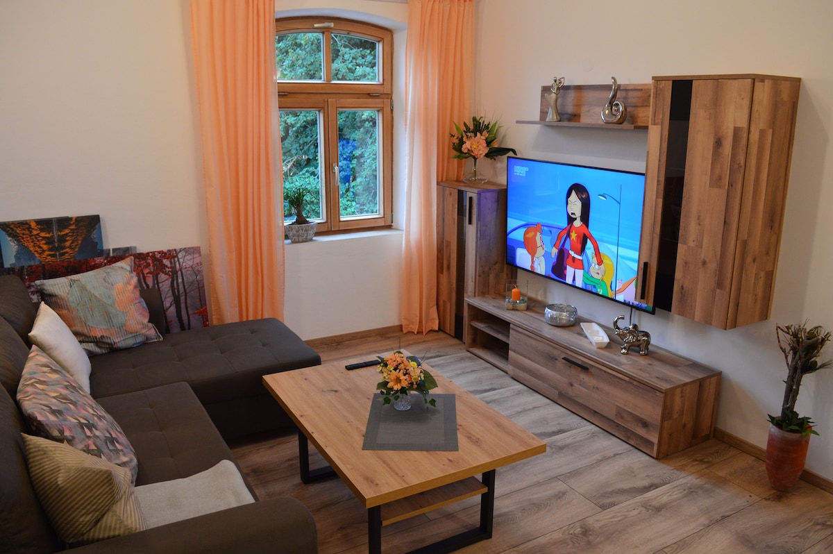 L'appartement de vacances est situé au 1er étage de notre maison familiale, qui est située à la périphérie et très calme. Dans la cuisine spacieuse, il y a une table avec 2 bancs, cuisinière, micro-ondes, bouilloire, cafetière à filtre. La salle de bain est équipée d'une douche et d'une baignoire. Les toilettes sont séparées. Dans la chambre, il y a 1 lit double (1,80 m) et assez d'espace pour un lit bébé. Dans le salon, il y a un coin salon confortable et un lit français (1,40 m).