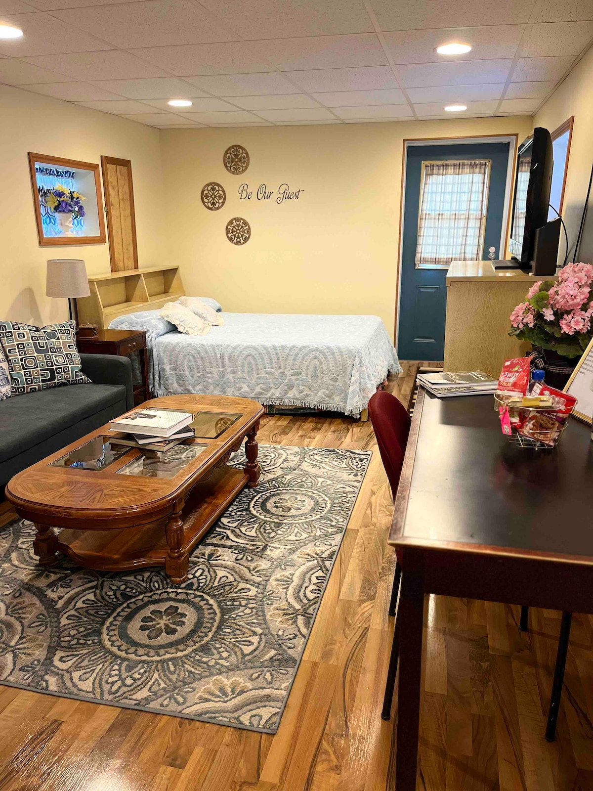 Petit refuge confortable pour une ou deux personnes avec lit Queen Size, kitchenette et salle de bain. Wifi, télévision à écran plat avec câble. Toute la literie et les draps sont fournis ainsi que le café et le thé et d'autres touches personnelles. Belle cour arrière et aire de pique-nique.