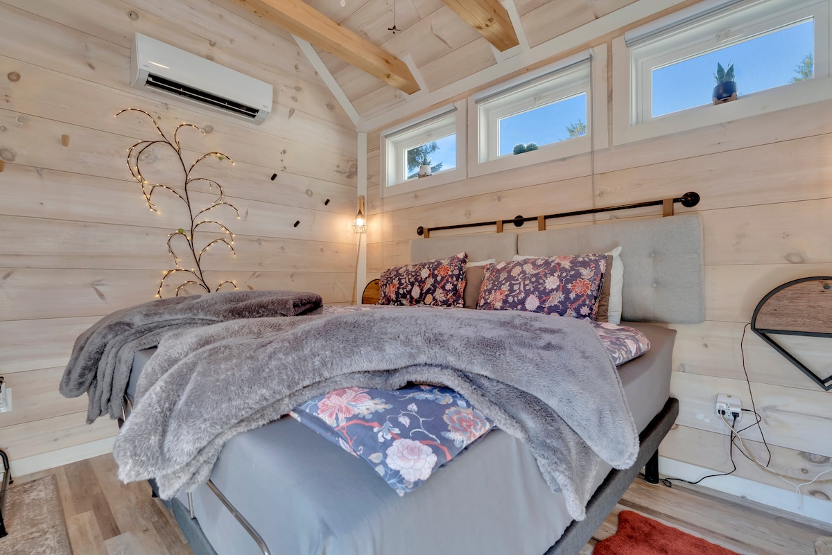L'objectif est que vous vous détendiez, rechargiez vos batteries, profitiez et respiriez. Nous offrons un JACUZZI privé pour 3 personnes, une douche chaude extérieure saisonnière et un foyer de cheminée, un SAUNA infrarouge, une baignoire autoportante de 72 pouces pour une expérience de spa ULTIME. Lit King Size avec sommier réglable et vibrant. La maison confortable de 600 pieds carrés est équipée de tout ce que votre cœur peut désirer. Design artistique à chaque coin de rue. Balançoires BOHO sur le porche privé. Nous sommes contigus à un terrain de 13 ac avec des sentiers de marche et de randonnée à l'arrière.