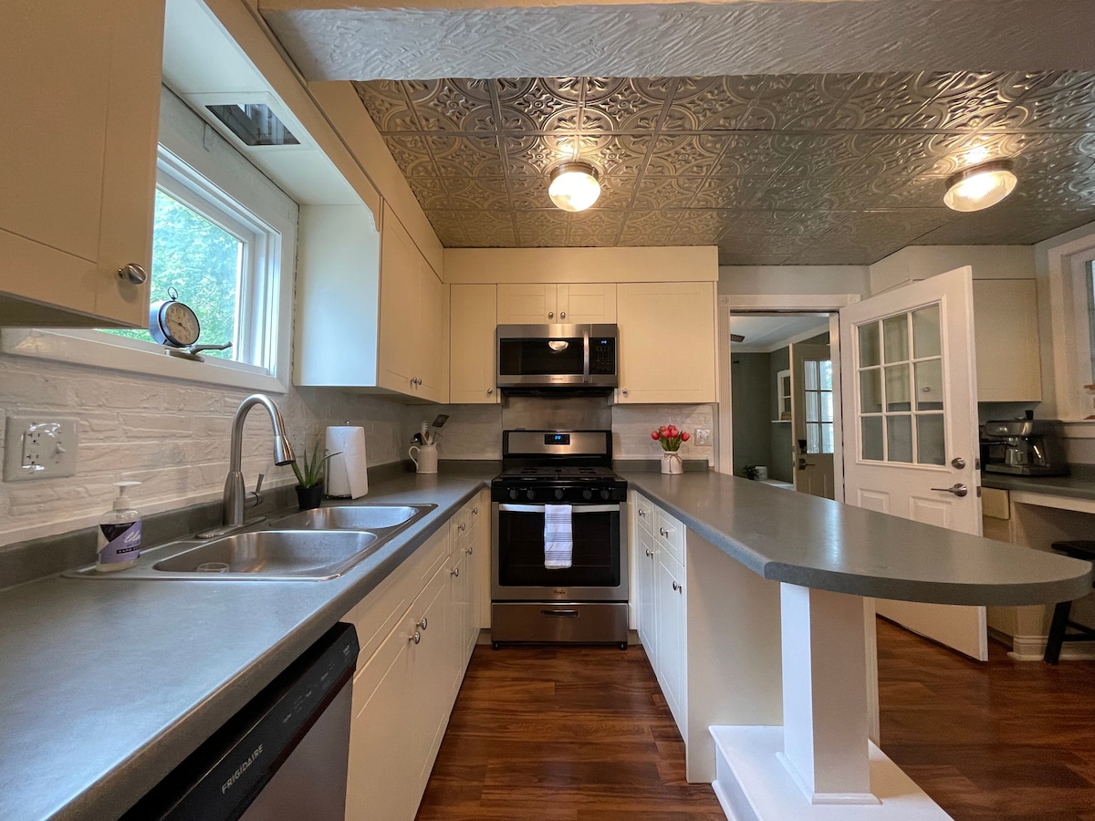 Détendez-vous et évadez-vous dans notre charmant chalet unique en son genre. Magnifiquement décoré avec des meubles d'époque et rénové avec goût avec des équipements modernes. Le chalet offre des carreaux d'ardoise et des planchers de bois franc. Des planchers de pin d'origine bordent les chambres du loft à l'étage. Cuisinez dans une cuisine de campagne d'inspiration française avec des comptoirs de billot de boucher. Cadre rural, mais à quelques minutes de tout ! Le centre-ville est à 20 minutes à pied et le Metra vous emmènera en ville en 45 minutes !