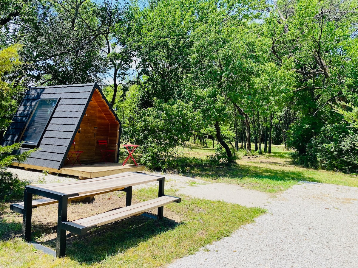 Observez les étoiles à travers les lucarnes en vous endormant dans ce chalet loft moderne. Réveillez-vous sur l'eau et profitez d'une planche de paddle ou allez pêcher. Ensuite, sautez sur le sentier ferroviaire de Southwind pour une balade revigorante. Cabin Chesini est situé au Base Camp en bordure de Humboldt, KS. Base Camp est un terrain de camping de luxe à service complet au point de départ du vaste réseau de pistes cyclables du Kansas. Nos cabanes modernes sur la rive de l'étang de la carrière offrent l'une des escapades les plus recherchées du Kansas.