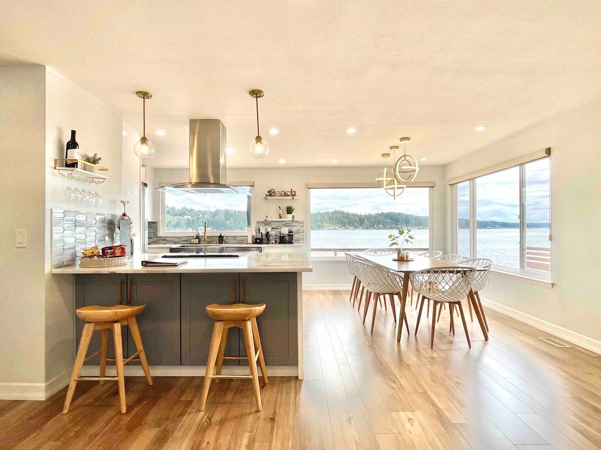 Le long des rives de la magnifique Case Inlet et à quelques pas de la plage, cette maison de 4 chambres en bord de mer est la destination d'escapade idéale. Profitez d'une vue à 180 degrés sur l'eau et d'un aperçu de la chaîne de montagnes Olympic par temps clair depuis la cuisine. Des aigles volent au-dessus de la maison et des phoques visitent les eaux devant la maison tous les jours, et si vous avez de la chance, vous apercevrez un petit groupe d'orques nageant pour trouver un repas ou une loutre prenant un bain de soleil sur le quai flottant.