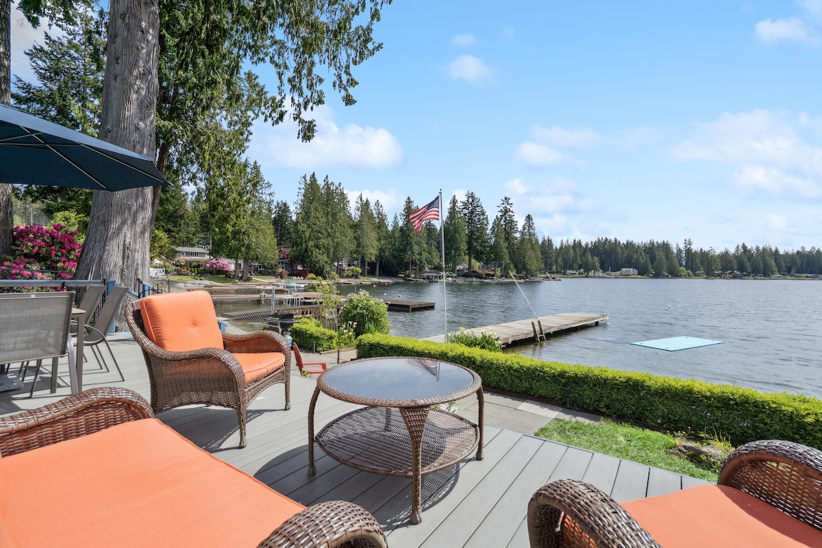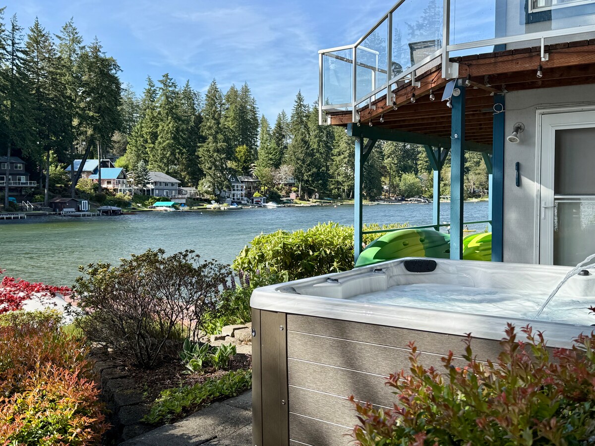 Revitalisez votre esprit et votre corps dans notre cabane rétro des années 1970 nichée dans les arbres sur les rives du lac Minterwood. Détendez-vous dans ce refuge élégant et riche en équipements avec sauna, jacuzzi et bassin d'eau froide, tout en regardant la faune vibrante se réveiller autour de vous. Pour une touche d'aventure, prenez un kayak ou une planche de paddle et explorez les eaux tranquilles de ce lac de Gig Harbor. Après une journée de divertissement, détendez-vous près du feu au bord du lac ou jouez aux cartes dans les espaces de rassemblement intérieurs.