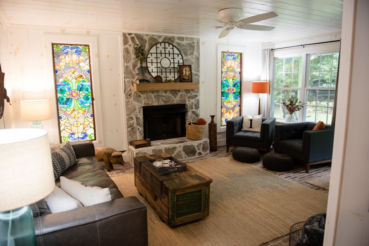 Cette adorable ferme moderne au bord d'un ruisseau sur 2 acres dans les montagnes Blue Ridge entre Ellijay et Blue Ridge GA est une trouvaille unique en son genre : certainement pas une cabane comme les autres. Il y a une cheminée et un foyer, des porches avec des chaises à bascule et une terrasse donnant sur un ruisseau, ainsi que des sols en briques, des murs et des plafonds en planches de bois, des fenêtres en vitrail, des portes françaises et des touches de ferme partout. Avec des vues et des sons d'un ruisseau impétueux dans le jardin, cette maison est un lieu magique qui crée des souvenirs.