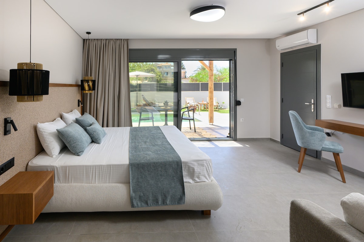 Évadez-vous dans Seafront Suites, une cachette privée au bord d'une mer bleue céleste sur la magnifique plage Rivera de Hersonissos. Niché dans une baie tranquille et isolée avec vue panoramique et couchers de soleil qui éblouissent, le reste du monde n'existe pas, vous donnant la liberté de libérer vos extensions et de vivre pour le moment. Plus d'informations Notre suite de luxe avec vue sur le jardin est moderne et minimaliste avec des chambres d'hôtes extrêmement confortables, des tons terre et des touches modernes pour apaiser l'esprit et réchauffer l'âme.