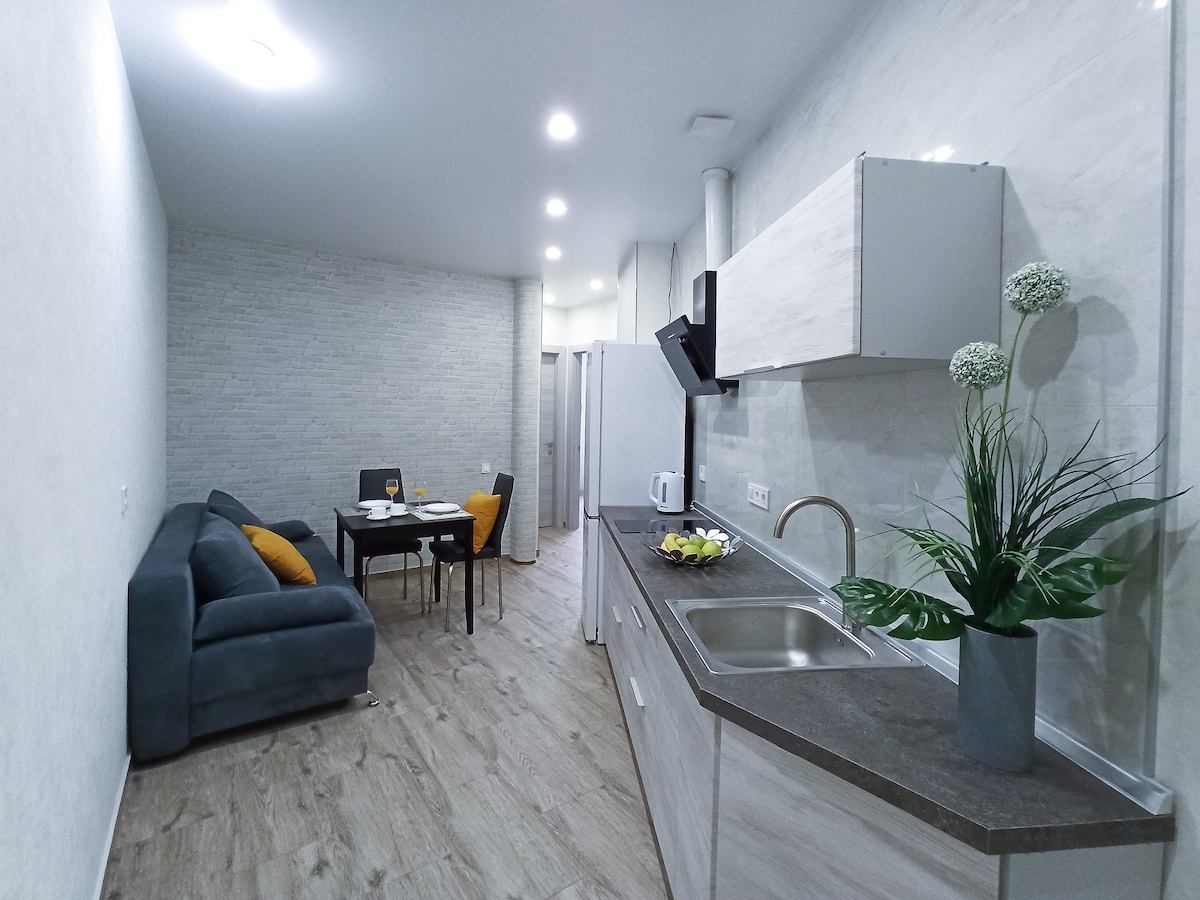 You will be accommodated in fully equipped studio 38m2. On the 5th floor Kitchen-studio + Bathroom Suitable for 3 people - 1 queen size bed (160*200cm) - 1 sofa bed 10 min walk to the sea (Ibiza/Itaka) 5 min walk to Gagarin plaza The nearest mall is just across the street (Kadorr city mall) p/s Smoking is strictly prohibited inside the apartment