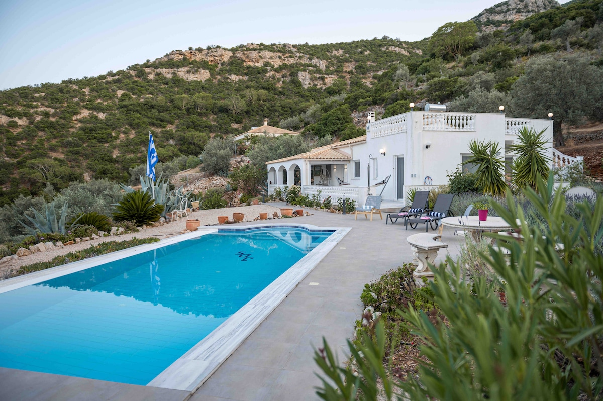 La Villa Phoebe est une maison spectaculaire avec piscine à débordement, à 2 heures de route d'Athènes à flanc de montagne d'olivier surplombant le magnifique littoral du Péloponnèse, près de Nauplie pittoresque et de nombreuses plages magnifiques, non loin des sites anciens comme Mycènes et Nemea. Refubée avec de nouveaux équipements, il s'agit d'une villa blanche et en marbre lumineuse et accueillante. Superbement meublé pour accueillir 6 personnes dans 3 chambres, entièrement climatisé, piscine à débordement, espaces en plein air, toit-terrasse, jacuzzi et sauna, au milieu d'une vue à couper le souffle