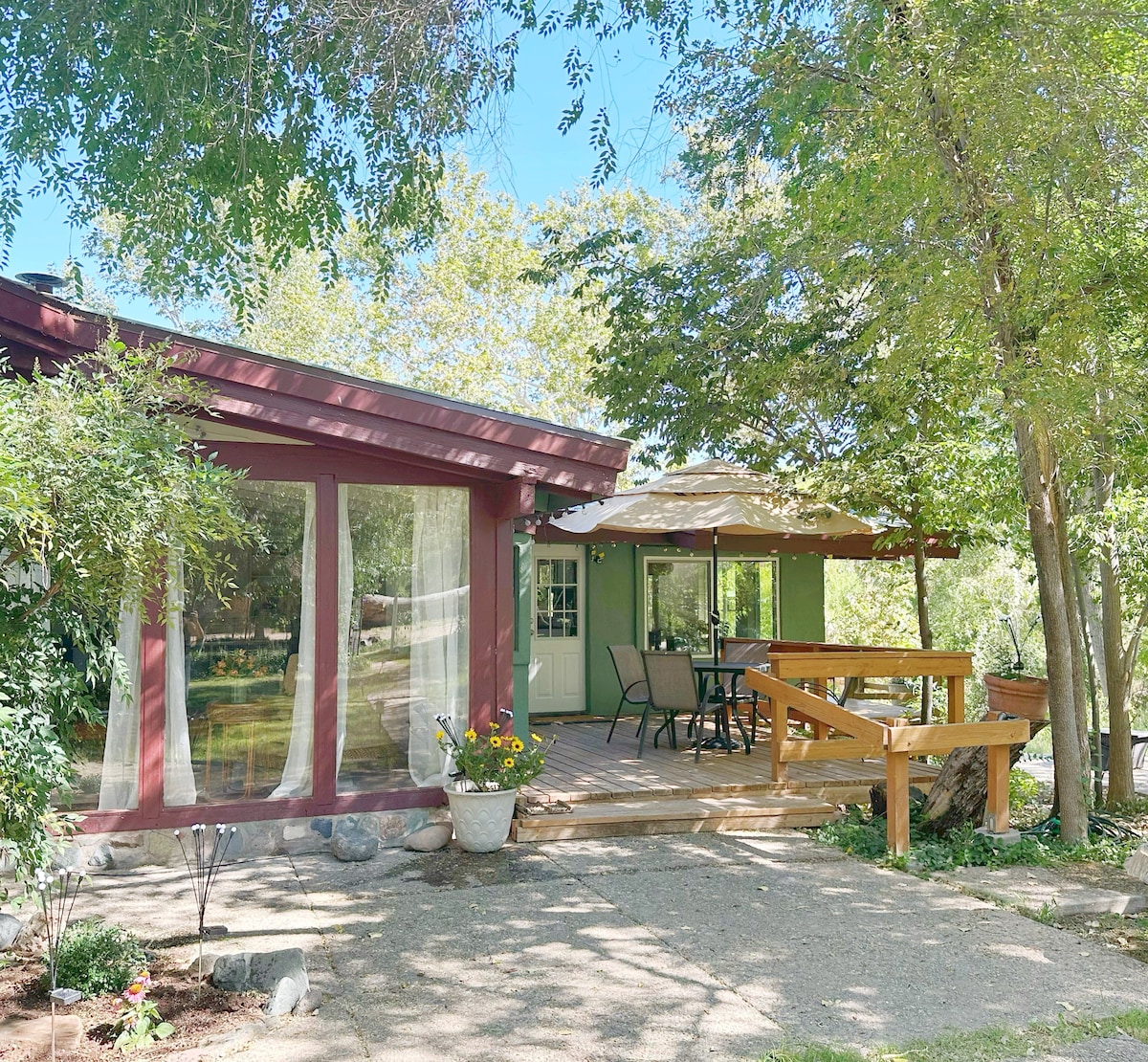 Nestled under sycamores and pines of a quiet neighborhood in the Heart of Sedona, Blackhawk’s Nest is a lovely 2 story cottage getaway on waterfront property. This home combines simplicity and elegance with its open-air design, adorned with original artwork, a graceful spiral staircase leading to a master bedroom and balcony overlooking a riparian woodland and views of Oak Creek. Relax to the sounds of flowing water, singing birds, cicadas, and wind through the pines.
