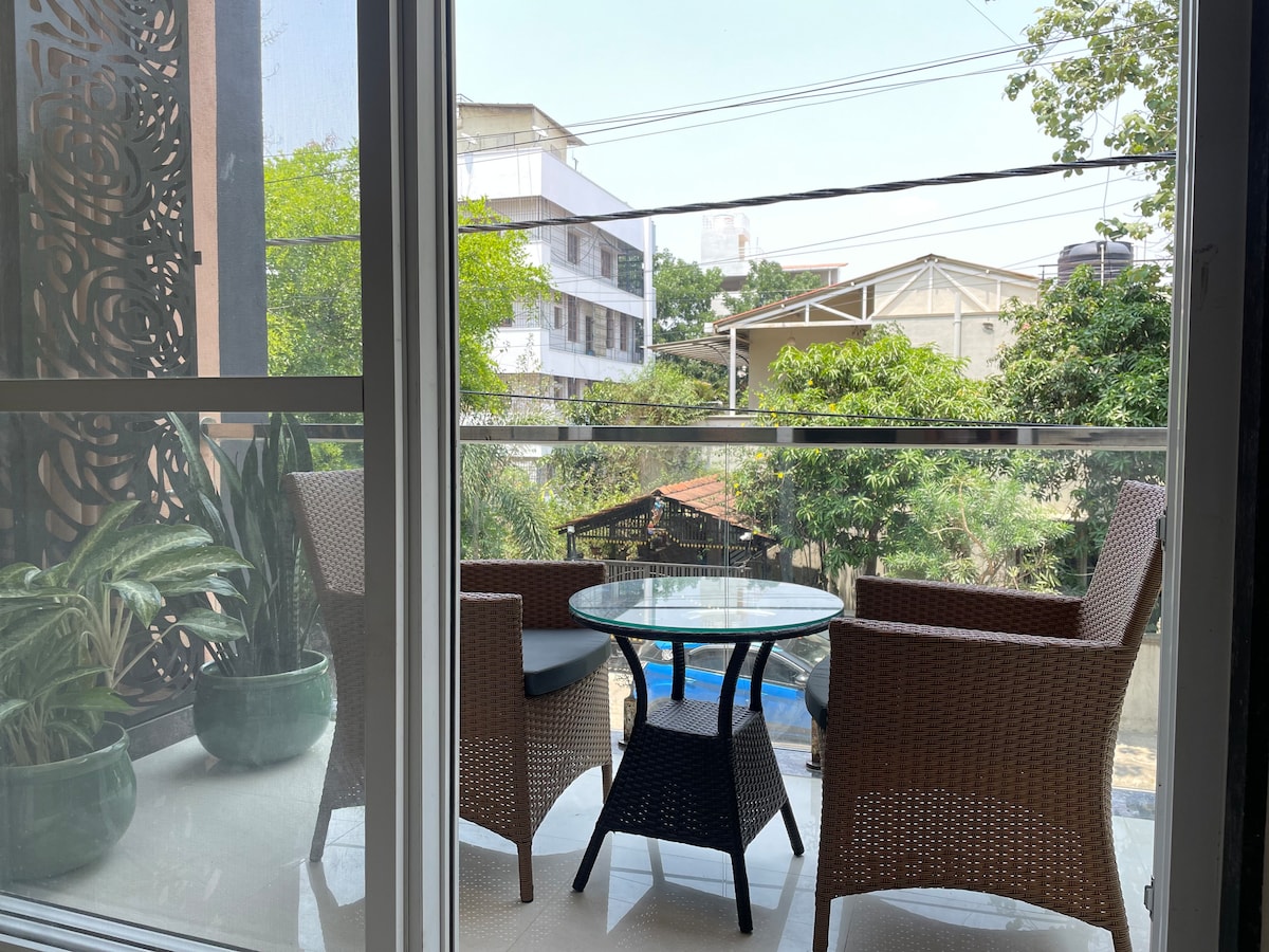 This Airbnb is in one of Bangalore's most desirable areas, Lavelle Road. This spacious & elegant studio unit is 450 sqft and is on the 2nd floor. The building has a lift. Cars can easily be parked in the basement. Guests can access the common spaces and the terrace of the building which has a great view of the Bangalore skyline. Guests can also order groceries, food, etc. on Zepto, Swiggy, Instamart and it will be delivered right to the doorstep.