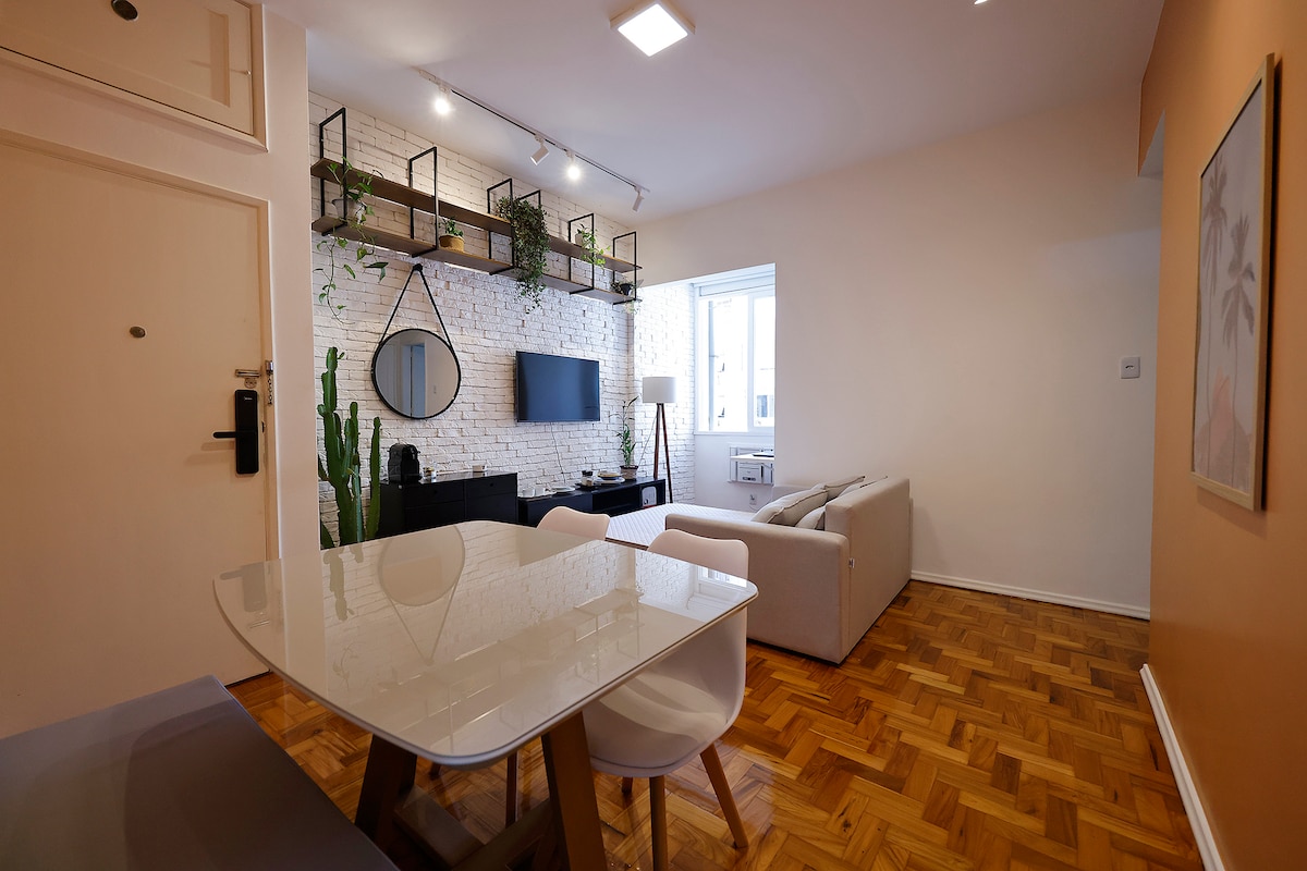 Séjournez dans un logement testé et approuvé par plusieurs voyageurs ! Appartement spacieux (45 m²) joliment décoré, calme (arrière). Chambre et salon séparés, avec climatisation dans les deux espaces. Cuisine équipée. Emplacement imbattable - À seulement 150 m de la plage de Copacabana - À 500 m de la plage d'Arpoador - À 600 m de la plage d'Ipanema - À côté du fort de Copacabana et du célèbre coucher de soleil d'Arpoador - Entouré de bars, de restaurants, de marchés et de toutes sortes de magasins Satisfaction garantie. Réservez maintenant.