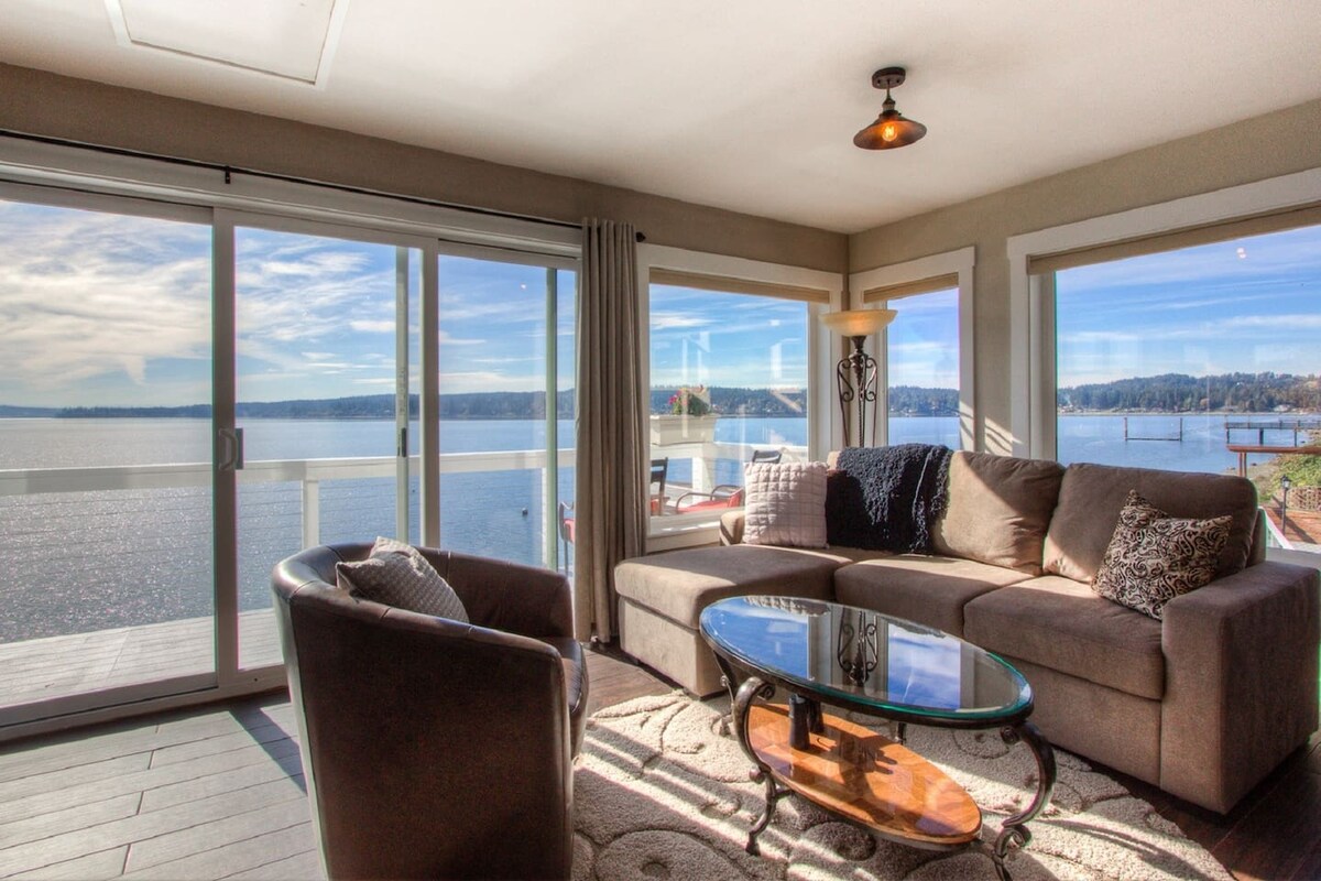 Profitez de couchers de soleil à couper le souffle et de vues à 180 degrés sur Puget Sound dans cet appartement haut de gamme de 140 m². Niché au bout d'une route privée sur l'île tranquille de Fox Island, face à l'île McNeil avec vue sur les montagnes Cascade et Olympic. Vous y verrez des aigles, des faucons, des cerfs, des phoques, des bateaux et parfois des baleines. Emplacement idéal pour s'évader et découvrir la sérénité de l'île ou pour visiter le charmant Gig Harbor. Une valeur incroyable pour cette retraite accueillante avec de nombreux équipements et un accès à la plage à proximité.