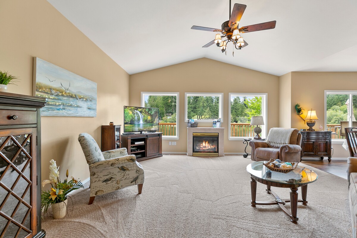 La vie est facile au Nid d'aigle - à 1,5 miles de la baie de Gig Harbor ! Entouré d'arbres et de vues sur la vallée depuis les 24 grandes fenêtres sur 4 côtés. Le 2e étage de 1200 pieds carrés est entièrement à vous pour vous détendre. L'immense cuisine entièrement équipée vous ravira et vous nourrira. Les plafonds voûtés aideront votre esprit à s'envoler ! Profitez du foyer électrique, de l'écran plat de 75" et du canapé inclinable. Profitez de la baignoire pour 2 ou de la douche pour 2 ! Détendez-vous sur la terrasse meublée. Profitez de l'ambiance de la campagne tout en ayant accès aux commerces et à l'autoroute.