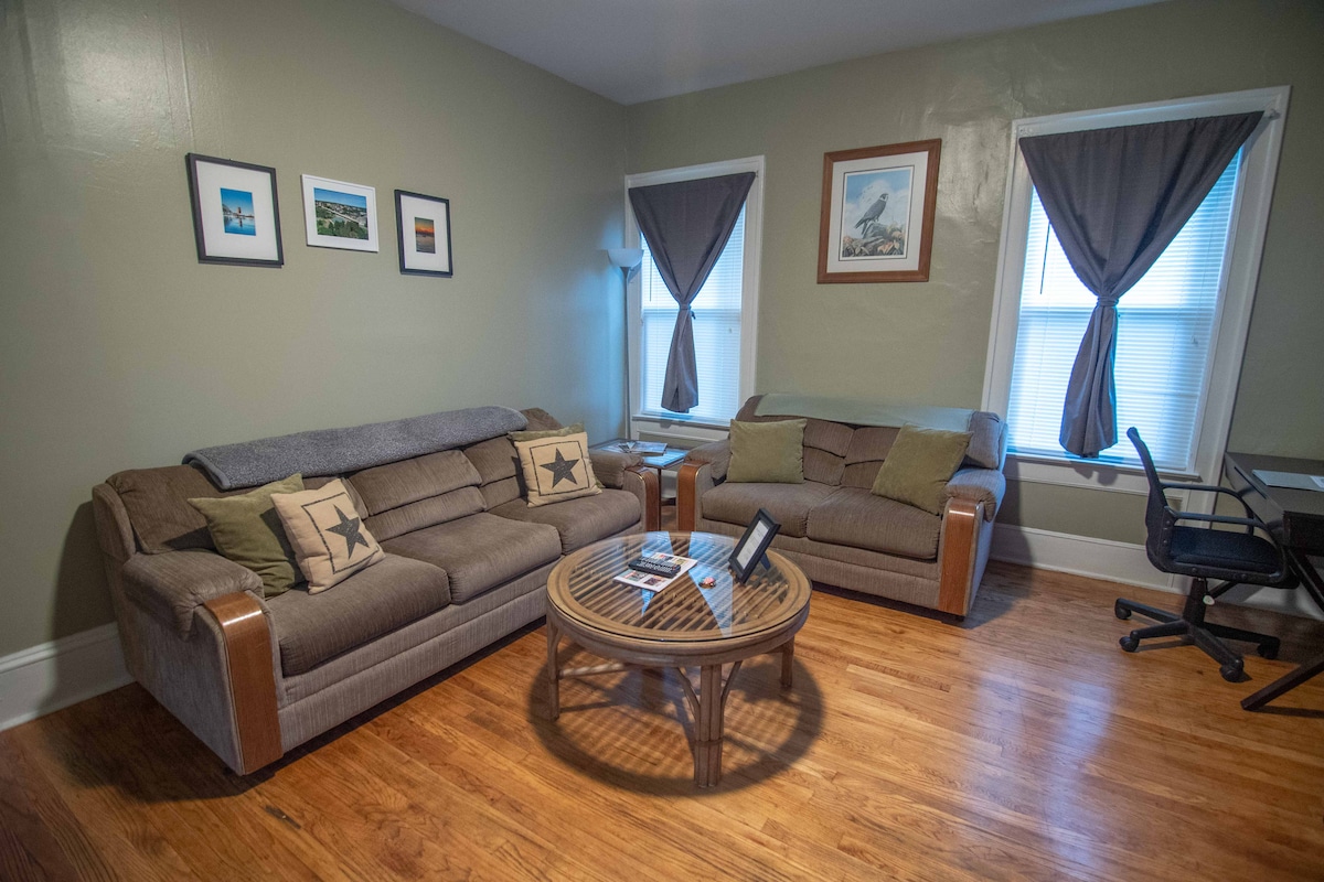 Appartement d'une chambre au 1er étage avec cuisine entièrement équipée et baignoire. Lit Queen Size et canapé-lit pour accueillir jusqu'à 4 personnes. À distance de marche du centre-ville de Jamestown. Disponible à court terme ou à prix réduit à la semaine/au mois. Animaux acceptés moyennant des frais, voir « autres remarques ». Stationnement gratuit dans la rue. Il y a des résidents vivant dans d'autres appartements de l'immeuble, tous amicaux et calmes. Le bâtiment a plus de 100 ans, il n'est donc pas moderne ou chic, mais confortable et abordable si c'est ce que vous recherchez.