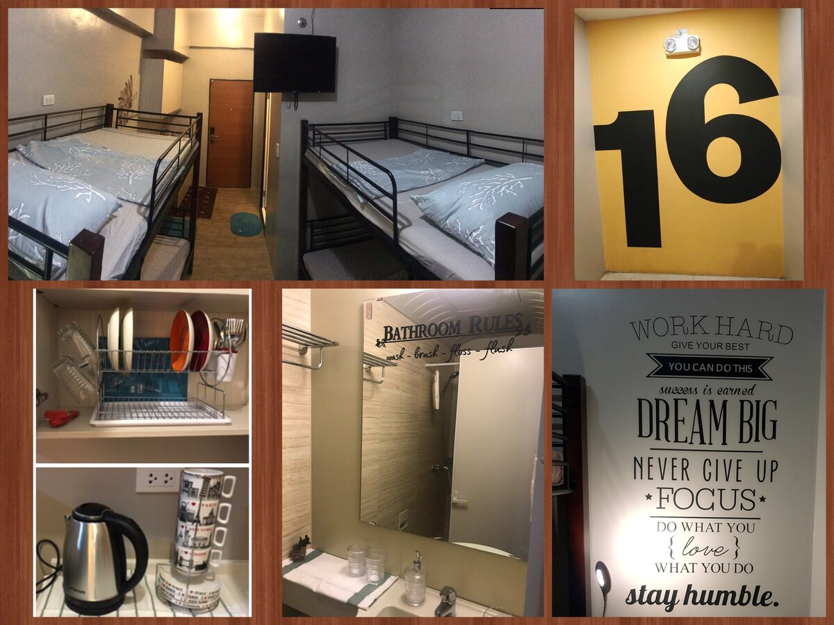 À deux pas de la gare TLR de Quirino Ave, l'ensemble de l'unité est entièrement meublé avec - 4 lits (2 lits superposés) - climatisation de type fenêtre - réfrigérateur - bouilloire électrique - four à micro-ondes - télévision - toilettes et baignoire propres avec chauffage pour douche - Wi-Fi gratuit dans les espaces communs, à l'intérieur du logement pour un abonnement au compte du voyageur. Les équipements comprennent: - piscine - salle de sport - salle de travail - salon pour accueillir des voyageurs.