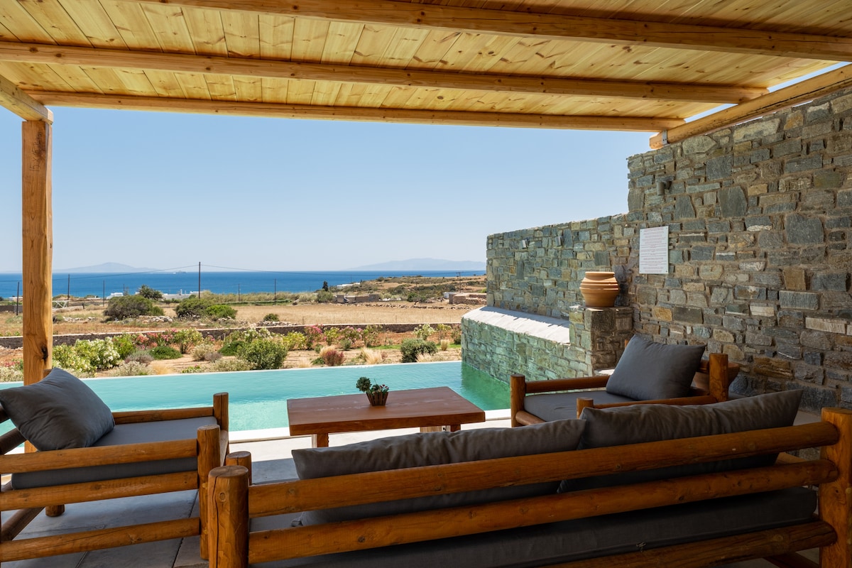 Le concept : Comme à la maison La villa de luxe ESTIA à Paros (Pirgaki-Dryos) est une propriété pour 4 invités. Construite sur un terrain unique, entourée d’arbres locaux, d'énormes oliviers, elle offre une vue magnifique sur le sud-ouest de la mer Égée et en particulier sur la plage de Lolantonis. La villa vous offre le sentiment d'intimité recherché dont vous avez besoin pour des vacances exceptionnelles. La vue depuis la piscine privée et depuis chaque pièce de la maison est unique.