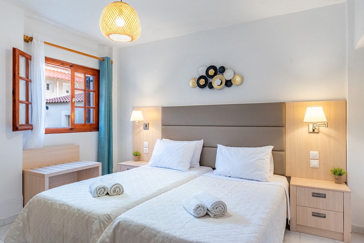 Cette propriété est un studio qui comprend un lit double et une salle d'eau avec cabine de douche. Le studio comprend un cadre merveilleux de cuisine entièrement équipée et un salon, le tout dans un environnement spacieux. Les fenêtres font face au jardin et à la vue imprenable sur la baie de Lakka. À l'extérieur, nous avons une belle terrasse avec une vue incroyable sur la baie et un jacuzzi privé. Vous pouvez utiliser la piscine partagée et les espaces salon et salle à manger partagés avec une vue exceptionnelle.