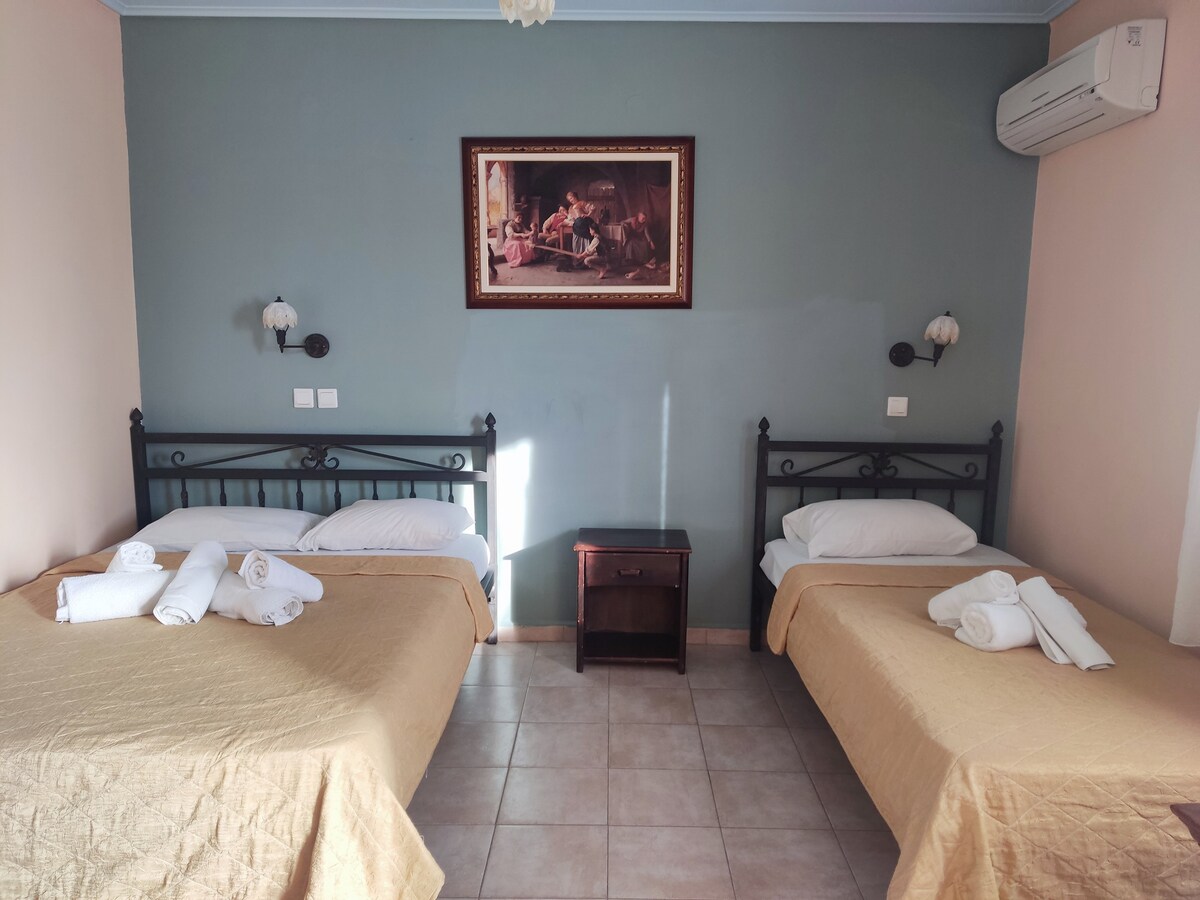 L'espace de Lenio #2 est une chambre de 30 m ² avec un espace différent pour la garde-robe !Elle dispose d'une salle de bains séparée et WC, d'un réfrigérateur et d'une cafétéria ! Elle dispose également d'un balcon privé donnant sur le mont Athos!