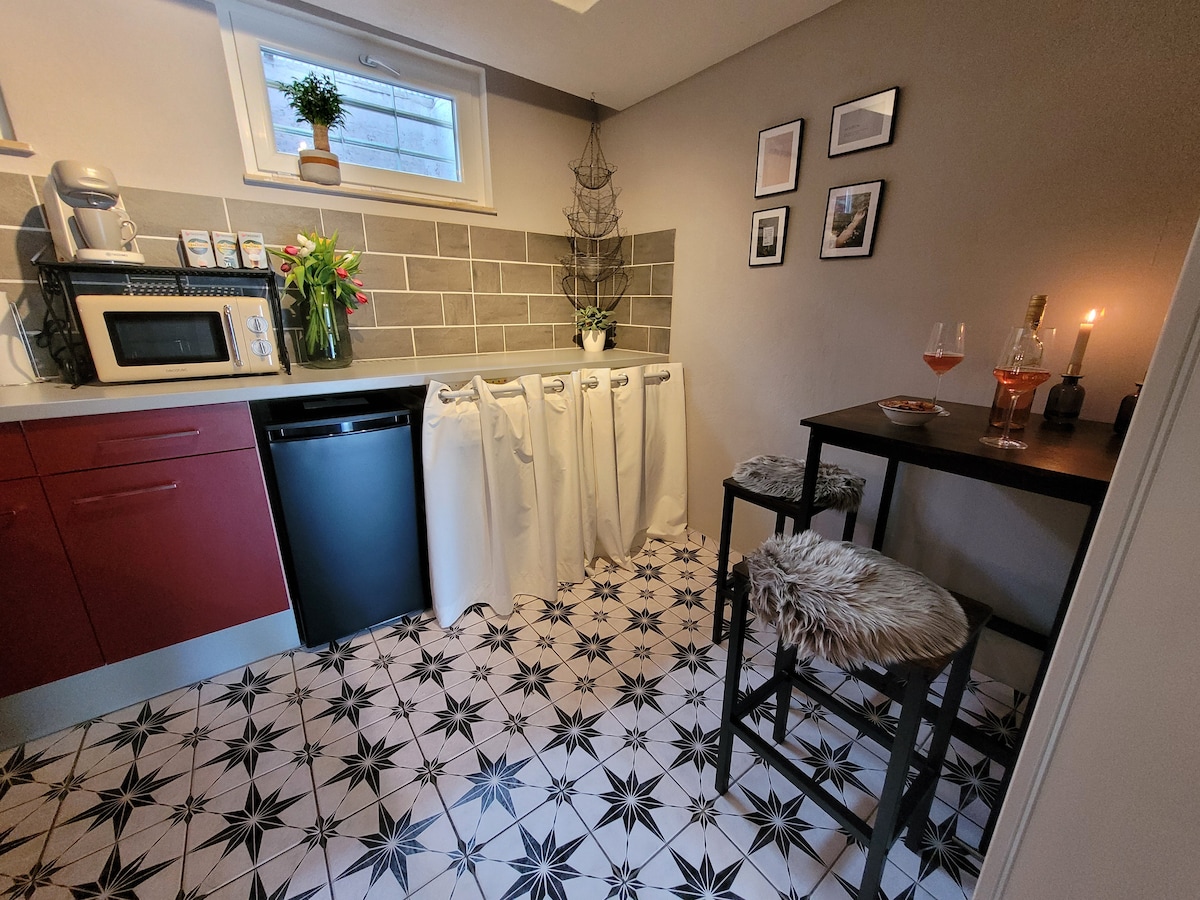 Dans l'ancien atelier dans le jardin du propriétaire, l'art est toujours présent et donne au logement rustique et confortable d'environ 45 m² et sur 2 étages son charme particulier. Un petit coin salon sous le marronnier et un barbecue en briques peuvent être utilisés par beau temps. Le centre-ville avec tous les commerces, l'arrêt de bus et bien plus encore est à 2 minutes à pied, la gare avec la station de train régional et express est à 10 minutes. Le célèbre lac de baignade est à 20 minutes