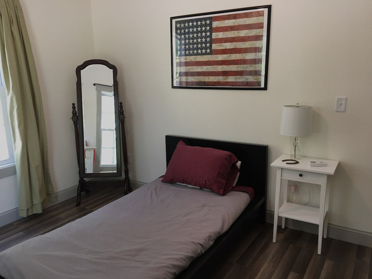 La chambre B est une petite chambre (10' x 10') mais confortable avec un lit de taille normale avec un matelas de luxe et une salle de bain privée (5' x 8') avec un chauffe-serviette et une douche en verre. La chambre comprend un bureau, une télévision, un mini-réfrigérateur, un micro-ondes, une cafetière, une commode, une chaise de lecture et une entrée privée. En été, nous avons des vélos à utiliser sur le chemin de fer et des kayaks pour la rivière Kennebec. Jacuzzi toute l'année. Le centre-ville est à seulement un pâté de maisons où il y a de nombreux restaurants et pubs avec de la musique live. Sentiers de randonnée et cascades à proximité.