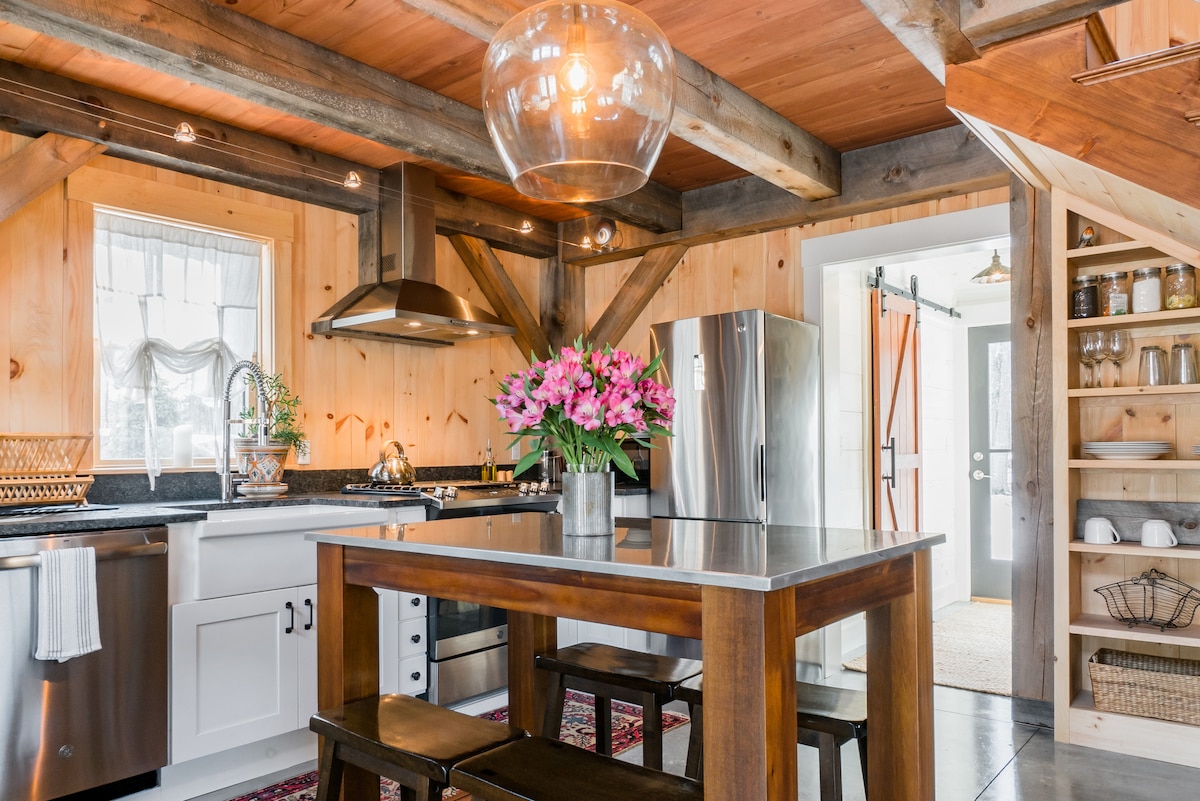 Évadez-vous dans un cottage à ossature de bois de rêve niché dans les bois du Maine ! Des poutres hautes, des sols chauffants, un lit mezzanine king size et un foyer crépitant vous attendent. Sirotez un café sur l'une des deux terrasses, faites une randonnée sur la montagne Bradbury (à 3 minutes), faites du shopping à Freeport (à 10 minutes) ou dînez à Portland (à 20 minutes), puis retournez dans votre refuge confortable sous les étoiles. Cuisine complète, plafonds voûtés, planchers chauffants, allée privée, foyer et vue paisible sur la forêt en font la retraite parfaite toute l'année.