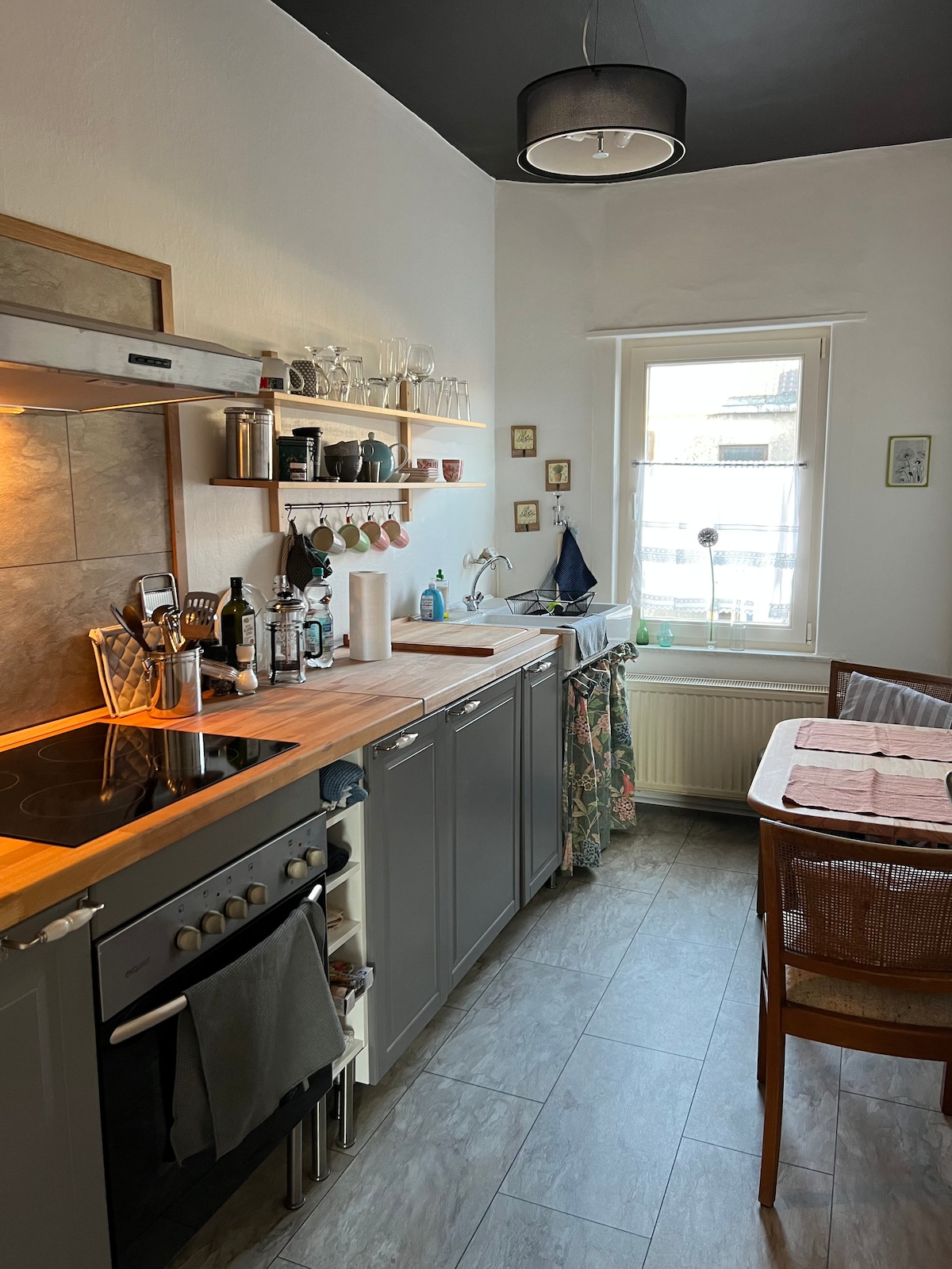 Bienvenue dans notre ferme au milieu de la nature. Notre appartement offre un charme particulier dans une vieille maçonnerie, mais est à l'intérieur sur une nouvelle construction. Tout est décoré dans un style maison de campagne confortable. Une cuisine avec 2 plaques de cuisson, évier, mini-four, gril de contact, réfrigérateur, cafetière et bouilloire offre tout ce dont vous avez besoin. Les draps, les serviettes, etc. sont fournis. Il est recommandé d'arriver en voiture, car l'arrêt le plus proche est à 1,3 km.
