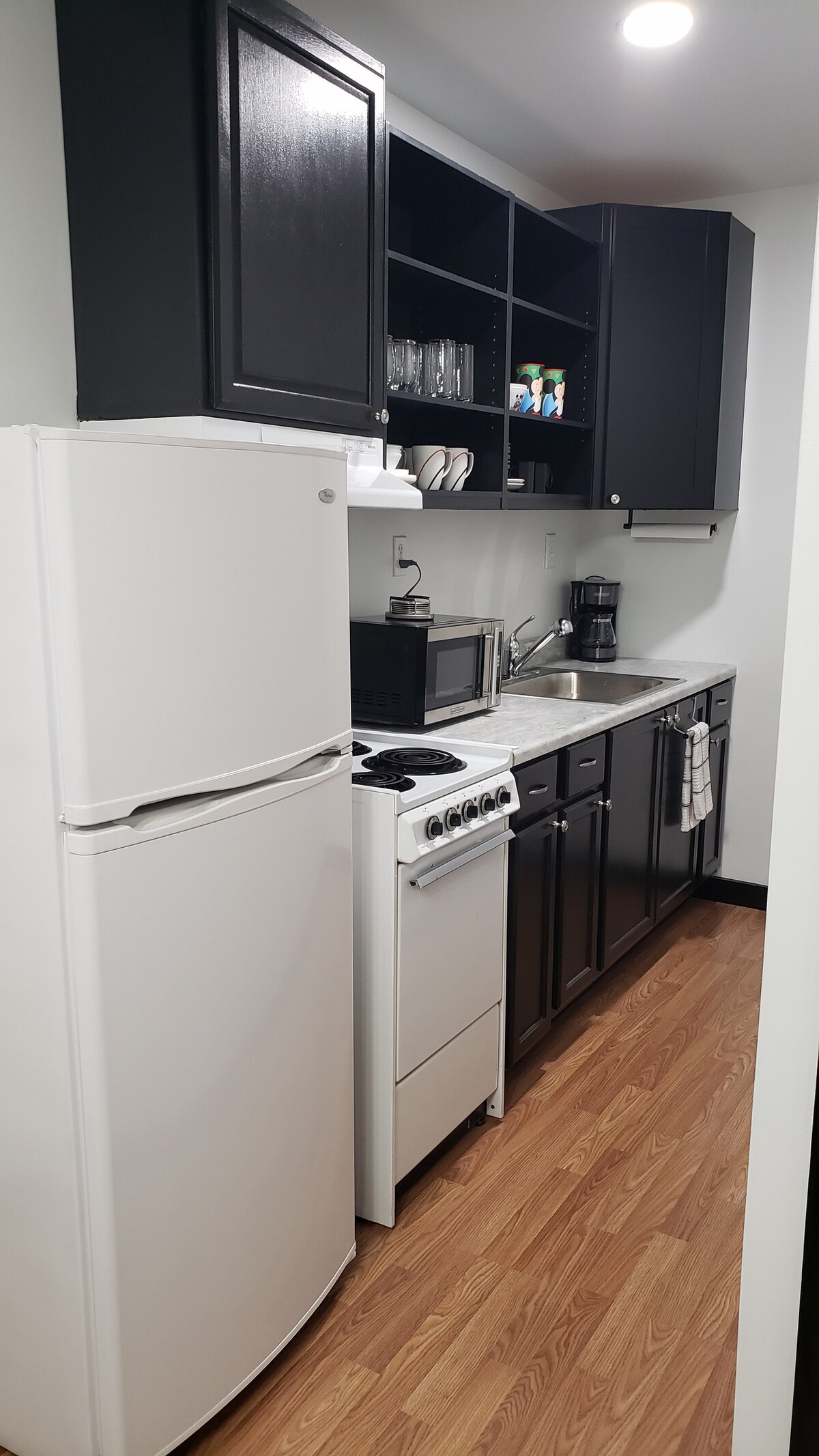 Cette suite confortable de 2 étages, 1 chambre et 1 salle de bain est parfaite pour deux à trois personnes. C'est une partie séparée de notre maison avec sa propre entrée privée. Le logement comprend une cuisine complète avec un réfrigérateur/congélateur, une cuisinière, une cafetière, un grille-pain, un mixeur, un four à micro-ondes et de nombreuses casseroles, poêles et ustensiles. Le salon dispose d'un canapé convertible queen size et d'une télévision connectée réglable. La chambre dispose d'une télévision connectée, ainsi que d'un canapé confortable parfait pour se prélasser. **Tout article volé sera facturé**