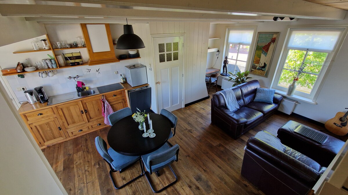 Ce charmant appartement, situé au premier étage, offre une vue imprenable sur les terres agricoles, est situé directement au bord de l'eau et offre beaucoup d'intimité. Par la porte d'entrée, vous entrez dans un hall spacieux où vous montez les escaliers et entrez dans l'appartement. Par le couloir, vous atteignez la chambre avec un confortable lit double à ressorts. En face de la chambre se trouvent les toilettes et la salle de bain spacieuse. Au bout du couloir se trouve le salon spacieux et confortable salon avec cuisine et aussi deux places de couchage.