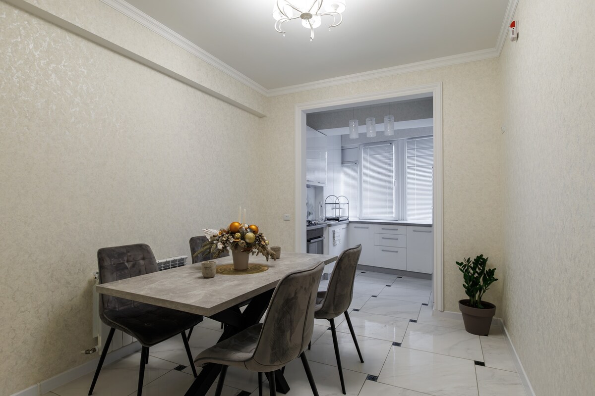 Ideal pentru familii, spațios, modern cu geamuri panoramice într-un bloc nou, in apropiere de centrul orașului, la (10 minute cu taxi 5€ ) de aeroport. Parcare subterană -14€ Locație excelentă,acces rapid la transport public, la 200 m de grădina botanică, supermarket, farmacie, restaurante, bănci ,grădină zoologică. Oferă tot ce aveți nevoie pentru o ședere plăcută, bucătărie complet utilată, 2 TV smart cu Netflix, Wi-Fi. Bucură-te de tot ce e mai bun în Chișinău din acest loc primordial