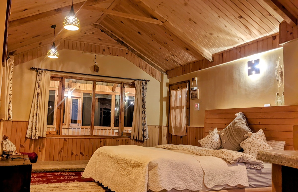 Une ferme en bois du XIXe siècle nichée dans un village tranquille de l'Himalaya, entourée de forêts de deodar, de pommiers et d'un ciel infini. Restaurée avec amour à l'aide de l'architecture traditionnelle Kath-Kuni, la maison est entièrement construite en bois et en pierre, avec un artisanat complexe, des plafonds sculptés et des fenêtres anciennes qui encadrent une vue sur la montagne. Que vous profitiez de nos repas locaux faits maison, de l'observation des étoiles ou de la promenade dans les vergers de pommiers, Nirvana n'est pas seulement un endroit, c'est un sentiment.