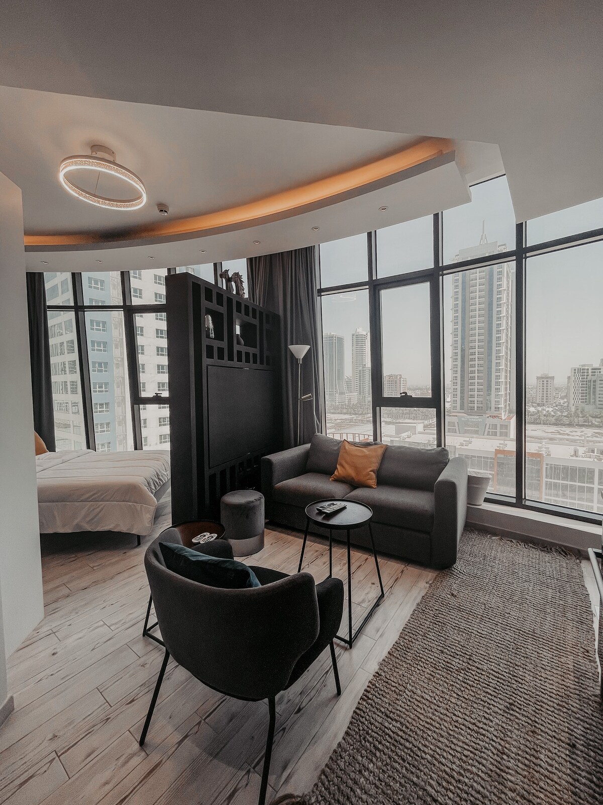 Wake up to breathtaking sunsets and skyline views. Located on the 35th floor, this cozy and modern apartment combines warmth, style, and comfort with beautifully designed interiors and thoughtful touches. Located in the city of Manama, this modern space is less than 15 min from exploring the city’s vibrant culture, markets, waterfront cafés, cultural attractions, top restaurants, and lively nightlife. The apartment is above the noise of the city, and is perfect for a peaceful escape!