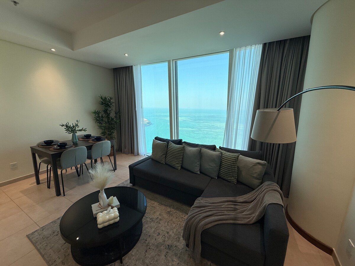 Profitez d'un logement élégant et central. 1 chambre avec salon et 1,5 salle de bain dans le quartier le plus luxueux de Bahreïn, pour 4 personnes, le canapé du salon peut être converti en lit. Salle de sport, piscine, parking privé avec vue imprenable sur la mer.