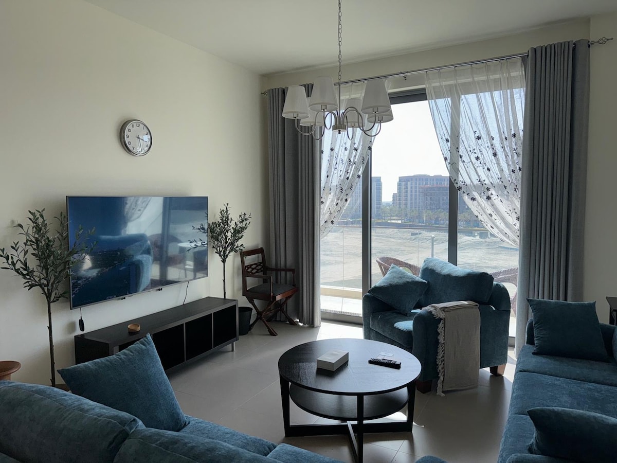Experience comfort and elegance in this modern one-bedroom apartment, thoughtfully designed for a relaxing stay. Located in a prime area, the apartment features a cozy living room with soft lighting, stylish furniture, and warm colors that create a welcoming atmosphere. The bedroom offers a king-size bed, soft linens, and calming blue curtains for peaceful sleep. Enjoy your meals at the wooden dining table beside the fully equipped kitchenette with all essential appliances