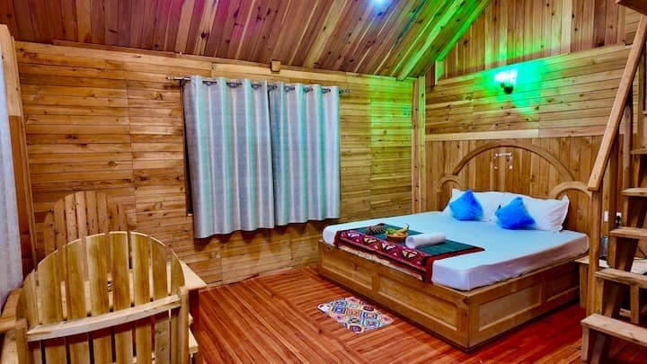 * Détendez-vous avec toute la famille dans ce logement paisible. un chalet en bois en plein montagne avec une vue spectaculaire * il y a une chambre spacieuse et un grenier qui fonctionne comme une chambre * Feu d'os 500/- * Wifi haut débit gratuit * notre gîte est dans l'un des plus beaux endroits de la ville. * Chaque voyageur qui a séjourné chez nous est parti heureux. * il y a un trek de 700 mètres, la cabane 99 % des jeunes adultes peuvent le faire.