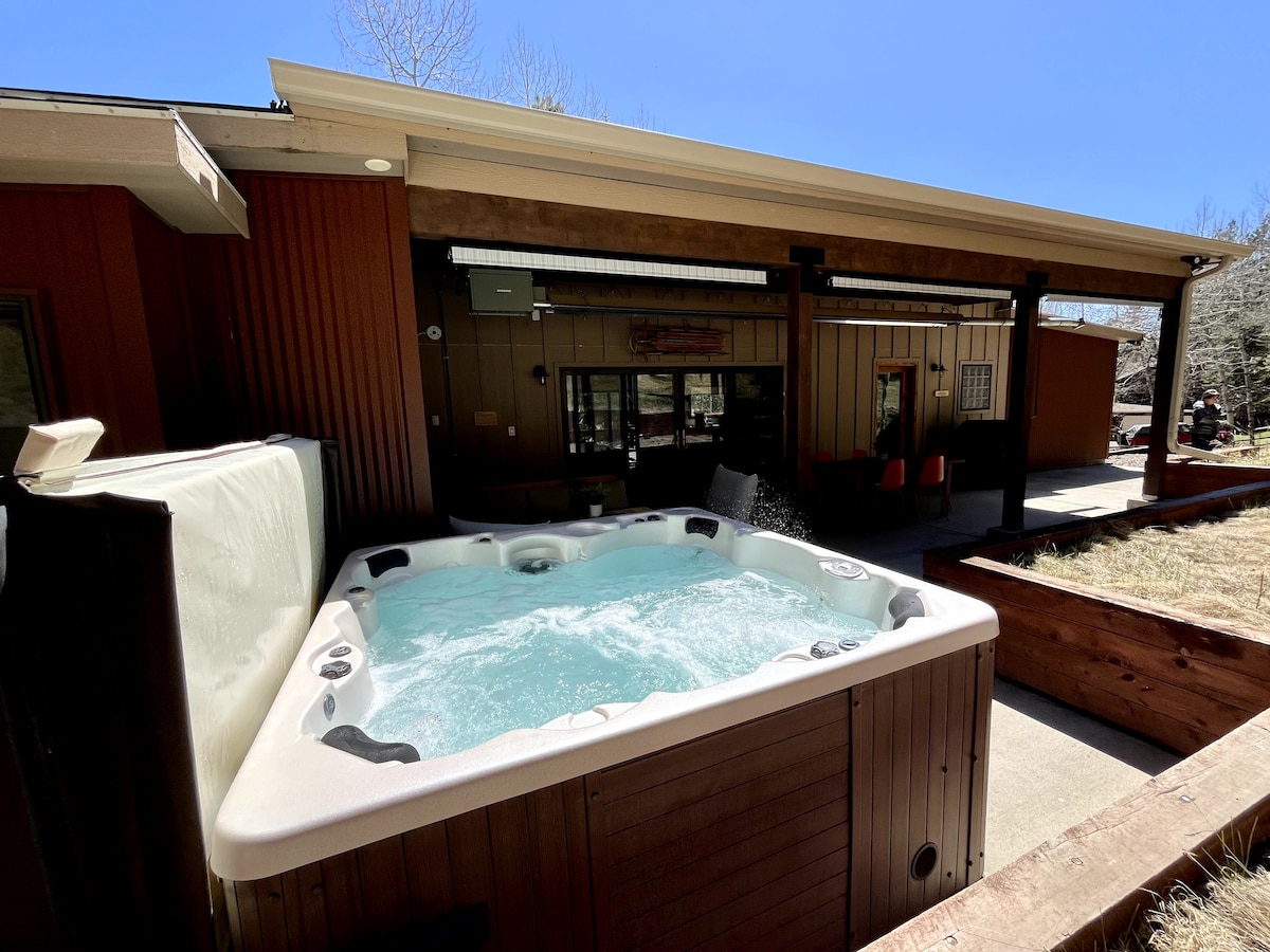 Installez-vous confortablement dans une charmante cabane pittoresque des années 1960 nichée dans un bosquet de trembles. Plongez dans le paysage de la forêt à feuilles persistantes à travers les larges fenêtres ensoleillées de notre espace confortable, doté d'une cuisine d'inspiration scandinave, d'un poêle à bois, d'un projecteur grand écran, profitant du monde extérieur à l'intérieur. À l'extérieur, écoutez les sons de notre ruisseau pendant que vous profitez du foyer, du jacuzzi ou du patio avec barbecue au milieu des montagnes Rocheuses. Nous sommes à 20 minutes du lac Evergreen.