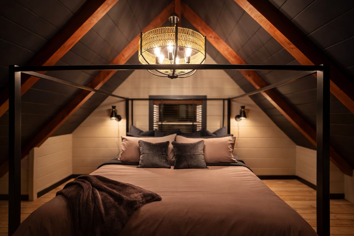 Nous avons construit la cabane Wren pour qu'elle soit un espace serein rempli de lumière et d'art et avec beaucoup de détails confortables. Plafonds en mezzanine, escalier en colimaçon et grand concept ouvert avec chambre en mezzanine. La cabane dispose également d'un magnifique sauna au feu de bois pour les jours les plus froids. Le chalet Wren dispose d'une grande terrasse enveloppante pour se détendre et d'un foyer extérieur, ainsi que d'un accès partagé à Adams Pond. L'espace est moderne et scandinave, lumineux et aéré, et rempli de détails bien pensés.