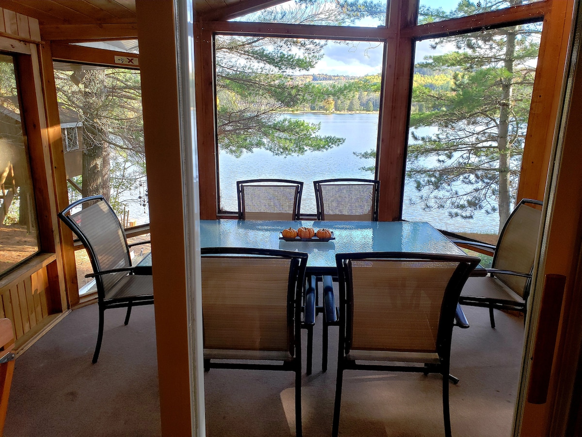 Notre petit chalet se trouve dans des pins surplombant le magnifique lac Kamaniskeg. Nous sommes près du parc Algonquin. Les récentes rénovations comprennent un espace décoré avec goût avec la sensation d'une cabane canadienne confortable. Les lits sont excellents. Vous pouvez profiter de la vue et de l'ambiance dans le porche avec moustiquaire surplombant une vue spectaculaire ou vous asseoir au bord du lac dans le patio. Le chalet dispose d'une cuisine entièrement équipée et de draps et de bain. Télévision par satellite également.