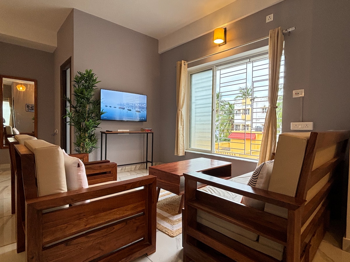 Offrez-vous le luxe de cet élégant studio situé près de l'aéroport et du centre commercial CC2. Parfait pour les couples, les familles et les amis à la recherche d'une escapade spéciale. Avec une connexion Internet haut débit de plus de 100 Mbps, cet appartement est également idéal pour ceux qui travaillent à domicile. Profitez de l'accès à la piscine et à la salle de sport sur place, et restez connecté car la propriété est bien située à proximité des principales attractions : à 6 km de l'aéroport international de Kolkata, à 1 km du City Centre II et à 2 km d'Eco Park.