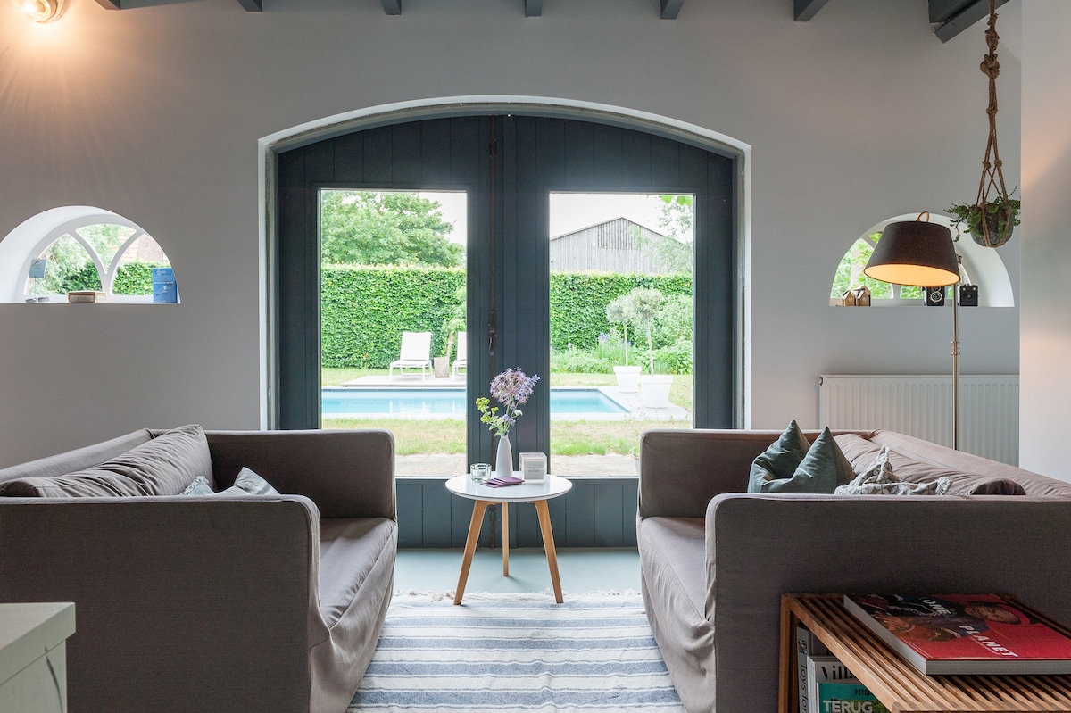Notre appartement de luxe (60m2), dans l'écurie rénovée d'une belle ferme au toit de chaume, dispose d'une chambre séparée (lit double à ressorts) avec des portes-fenêtres donnant sur un grand jardin avec des sièges et des chaises longues. L'appartement dispose de son propre sauna, bain à remous, douche et toilettes. Et un beau salon et une cheminée chaleureuse. Si vous souhaitez prendre un petit-déjeuner ou utiliser le sauna, nous vous demanderons un supplément limité (12,50 € par personne pour le petit-déjeuner de luxe et 50 € pour le sauna pour 2 personnes). Séjour minimum de 2 nuits