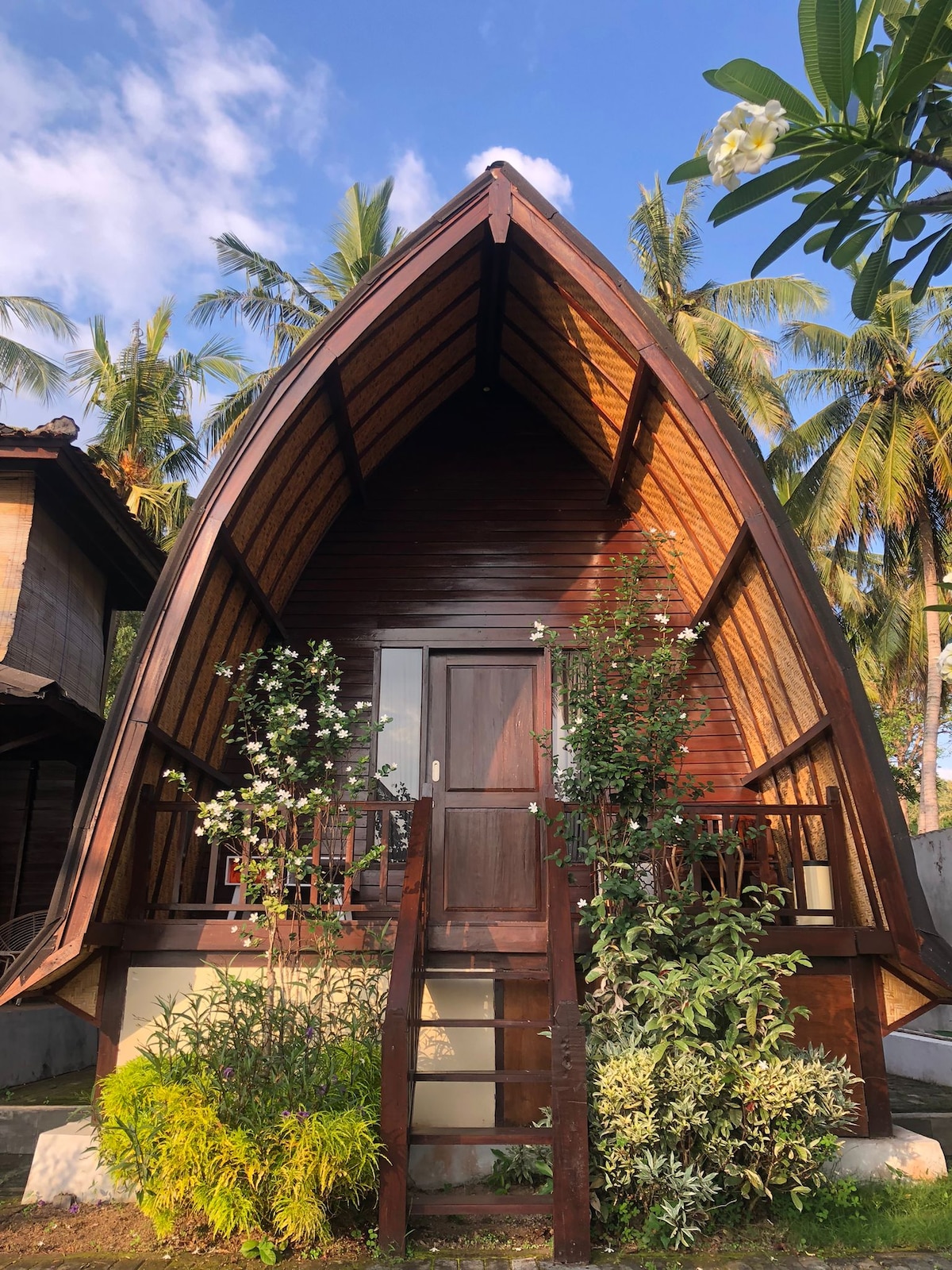 Discover serenity at Villa RR Senggigi, where ocean views meet lush coconut trees. Each wooden and bamboo-crafted villa offers a cozy tropical ambiance that blends comfort with nature. Enjoy your morning coffee while gazing at the sea, or unwind with a breathtaking sunset right from your private balcony. With a calm atmosphere, green gardens, and sea breeze all around, this is the perfect place to relax and recharge.