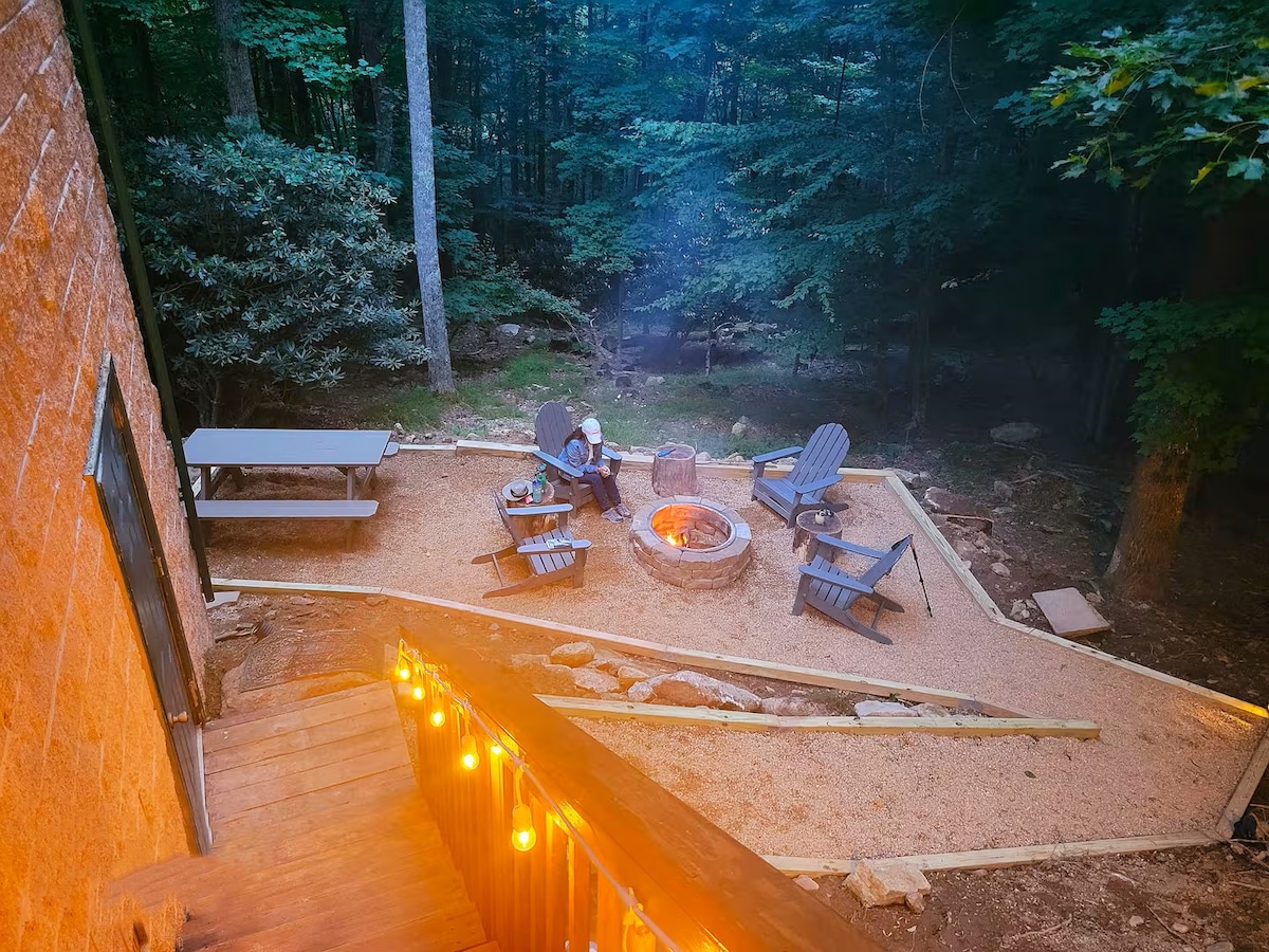 Classic 1970 A-Frame 15 min to King Street/ Downtown Boone, NC! Family traditions start here. - 3 floors w/bedroom + bath on EACH LEVEL - Forest Views perfect for spotting deer - 6 seat Hot Tub, deck + Arcade w/ 60+ Games - Fire pit, Gas BBQ Grill, Cornhole - 2 living rooms w/ smart TVs, gas log fireplaces. puzzles, games + books - Coffee bar: drip + french press, locally roasted beans c/o Hatchett Coffee - 🐶 Welcome Explore more: @appalachianaframe