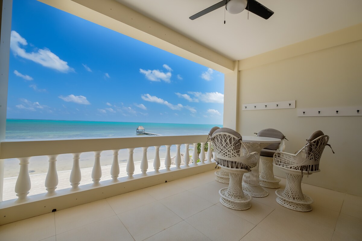 This Ambergris Caye vacation rental is situated just 3.5 mles south of the heart of San Pedro Town and sits directly on the white sandy shoreline with perfect views of the turquoise-toned waters of the Caribbean Sea. The location is so close to the beach that you can go from taking a refreshing plunge in the pool to splashing around in the sea in seconds. This condo is on the third level just behind the pool and has a long covered wrap around patio for the most incredible views and outdoor space