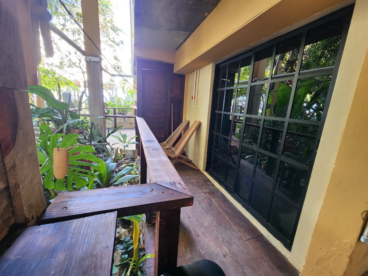 Large space with tall ceilings, spacious and on the ground floor in the garden. Private and peaceful. A king size bed and a twin are in your private room. AC and a hip very private shower, with toilet and sink. Hot and cold water in the shower and sink. Over 100 trees on the property with tons of birds! There is a separate building with a full kitchen to cook or hang out with other guests. Its a 3 minute walk to the beach, restaurants and grocery stores. Laundry service available!